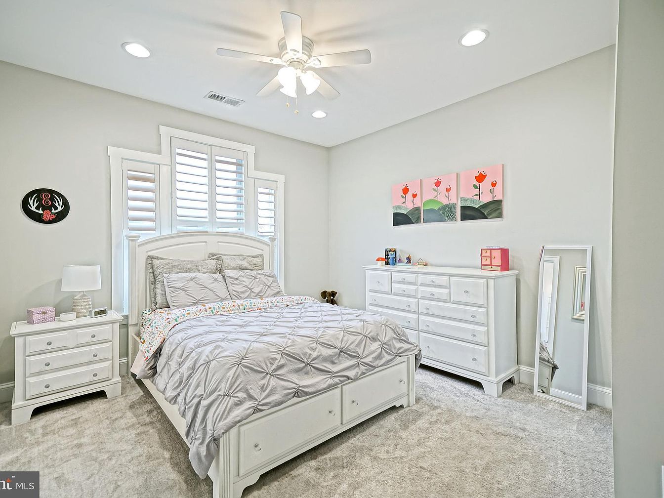 This bedroom features a cozy design with a plush bed adorned in a silver quilt and patterned throw, conveying a serene atmosphere. The walls are a soft muted gray, enhancing the airy feel. A pair of elegant white nightstands flanks the bed, one holding a lamp and clock, while the other adds a decorative touch with storage. A large dresser with matching white finish complements the space, topped with colorful accessories and a mirror. Natural light filters through plantation shutters on a unique window design above the headboard, highlighting the cheerful floral artwork that adds a pop of color.