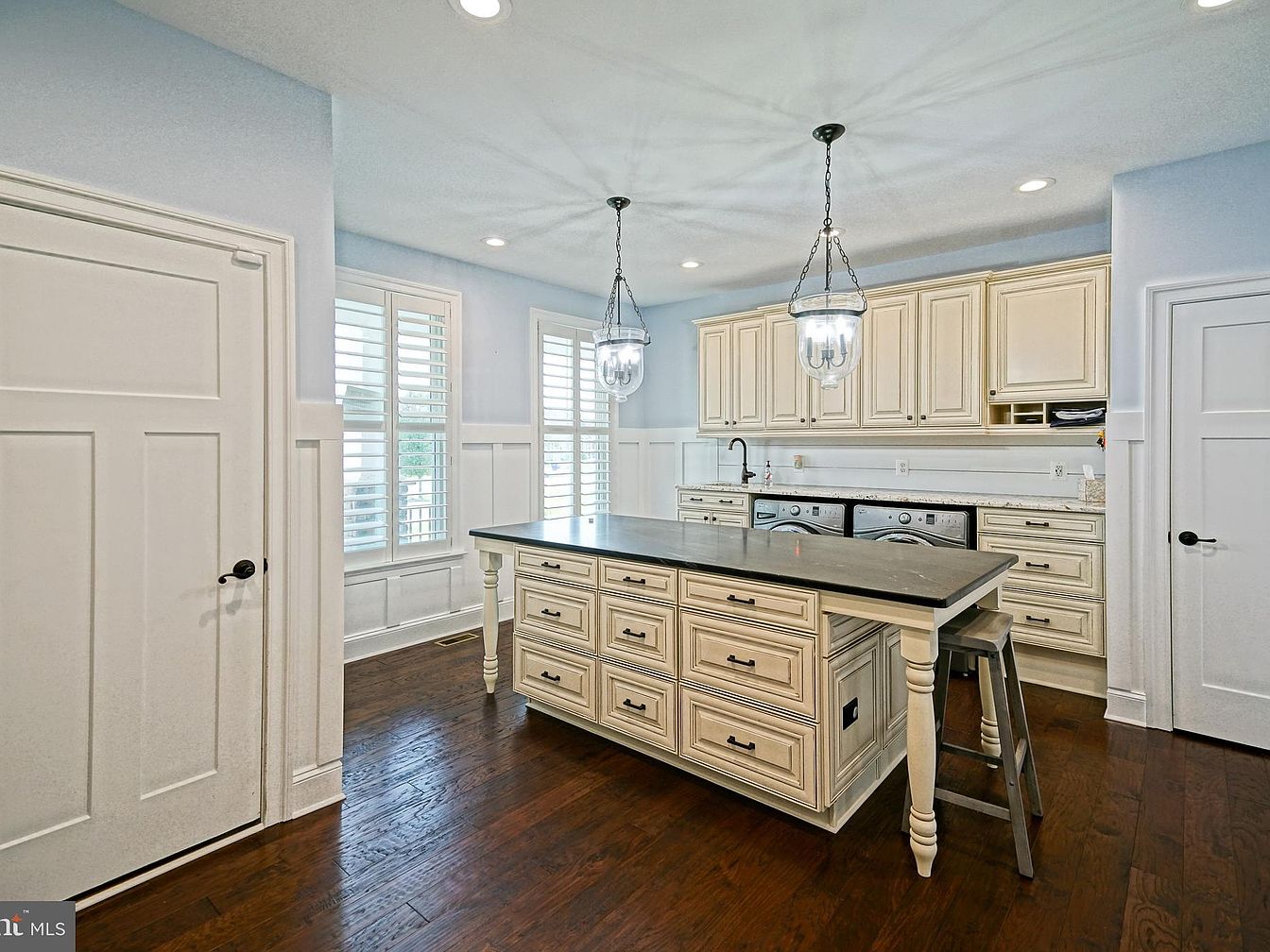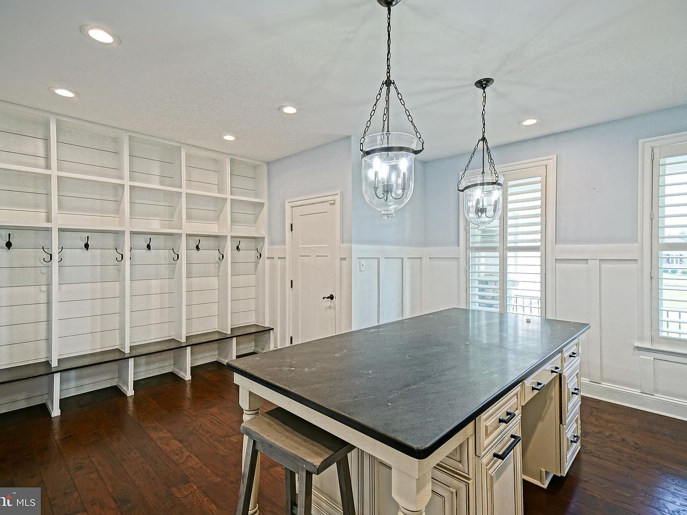 This mudroom features a light and airy design, highlighted by soft blue walls and crisp white wainscoting. A large wall of built-in shelves offers functional storage with hooks for hanging coats and bags. The dark hardwood floor contrasts beautifully with the lighter elements, enhancing the warmth of the space. An island with a sleek dark countertop provides additional workspace or seating, complemented by light-colored cabinetry. Unique pendant lights hang from the ceiling, adding a stylish touch, while plantation shutters on the windows allow for controlled natural light, making this room both practical and inviting.