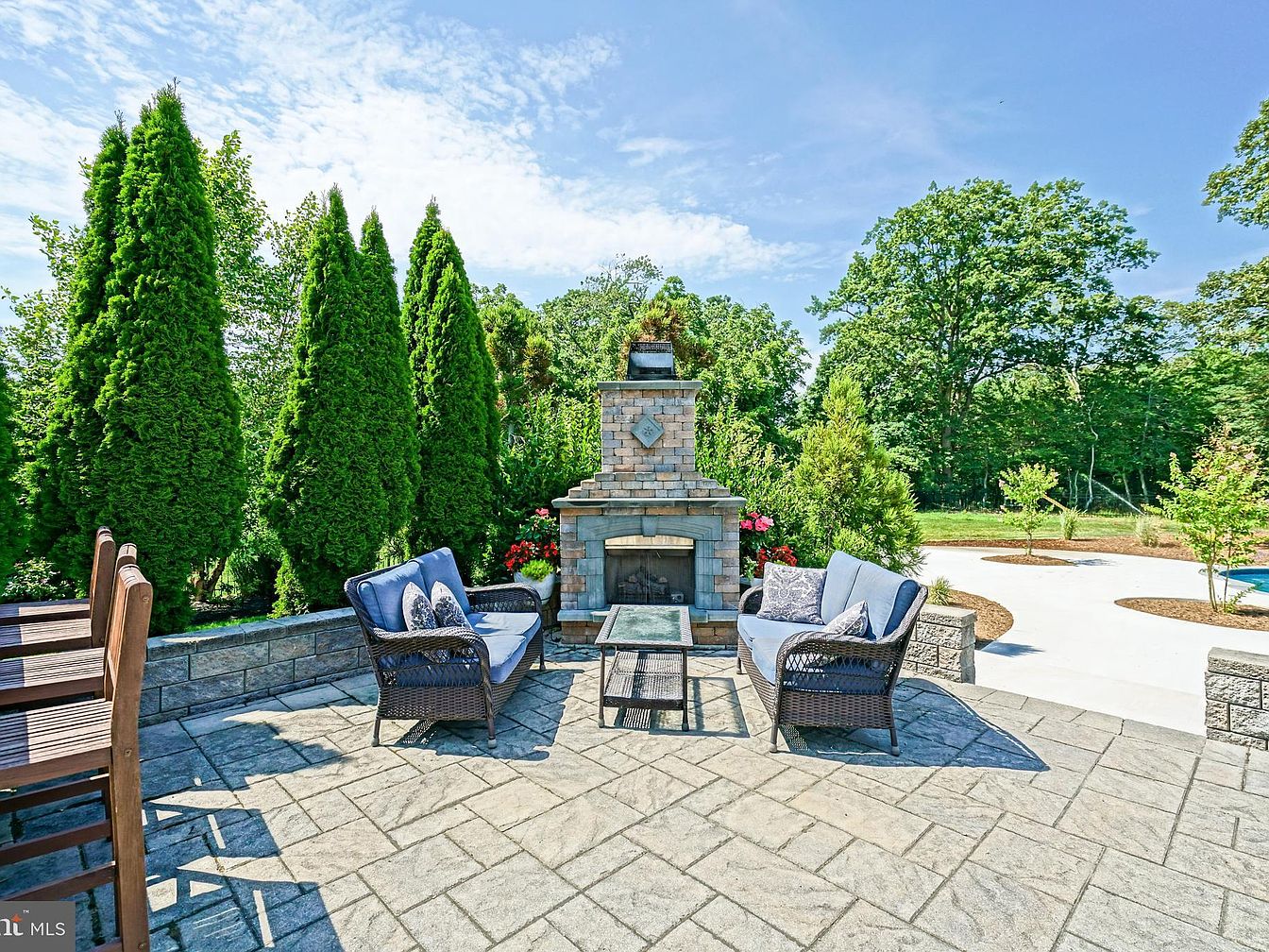 This outdoor patio features a stylish, stone-framed fireplace as its focal point, complemented by elegant landscaping. The space includes plush, blue seating with decorative pillows, arranged around a glass-topped table, providing a relaxing gathering spot. Tall, lush evergreen trees flank the area, creating a natural privacy screen. A rustic wooden dining set sits nearby, adding charm and a sense of warmth. The patio is paved with large, textured stone tiles, enhancing the sophisticated aesthetic. Bright flower arrangements add vibrant color against the greenery, while the clear blue sky above contributes to the tranquil atmosphere.
