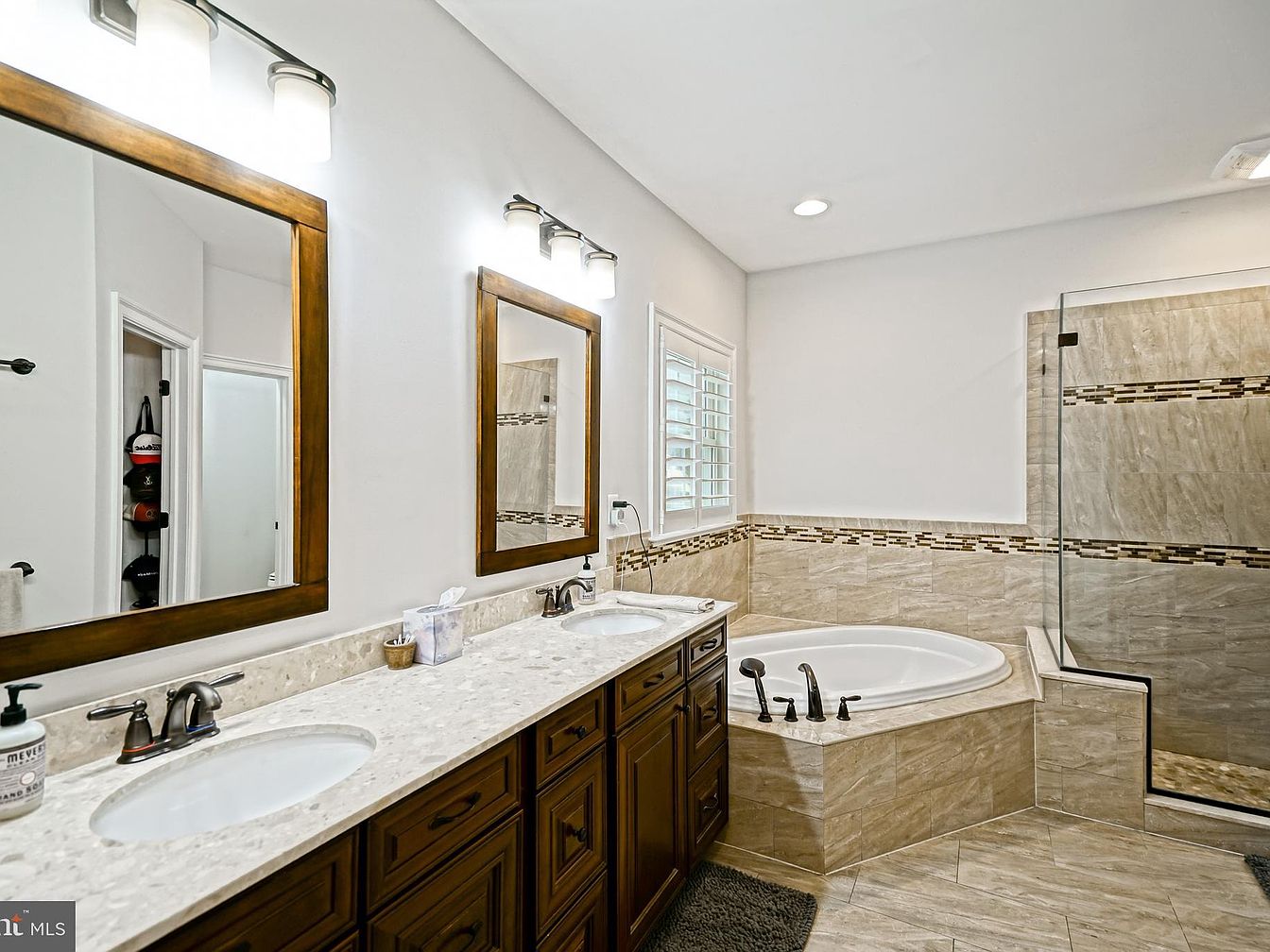 A spacious bathroom featuring a dual-sink vanity with rich brown cabinetry and a light granite countertop. Above each sink, framed mirrors reflect the warm glow from contemporary light fixtures. The color scheme balances neutral walls with earthy tones in the tile flooring and backsplash. A luxurious, jetted bathtub is nestled in one corner, surrounded by a tiled deck. Adjacent, a glass-enclosed shower boasts stylish tile work, enhanced by a decorative stripe. Natural light pours in through small window shutters, creating a serene ambiance. Soft gray rugs add comfort and warmth to the overall design.