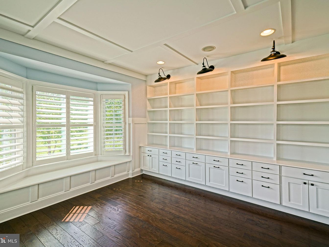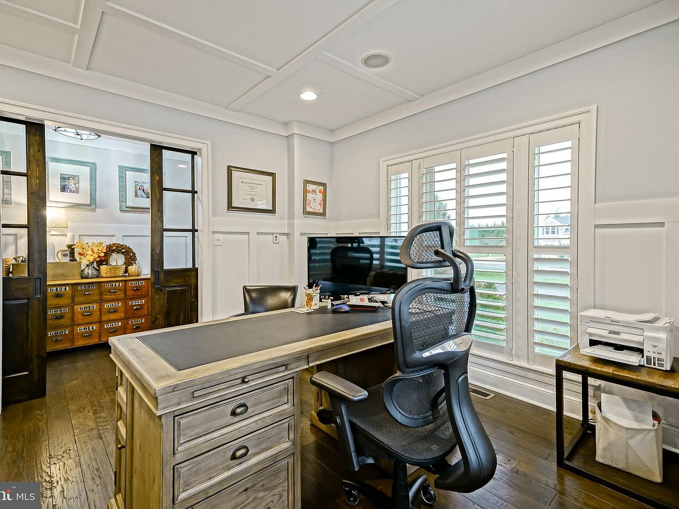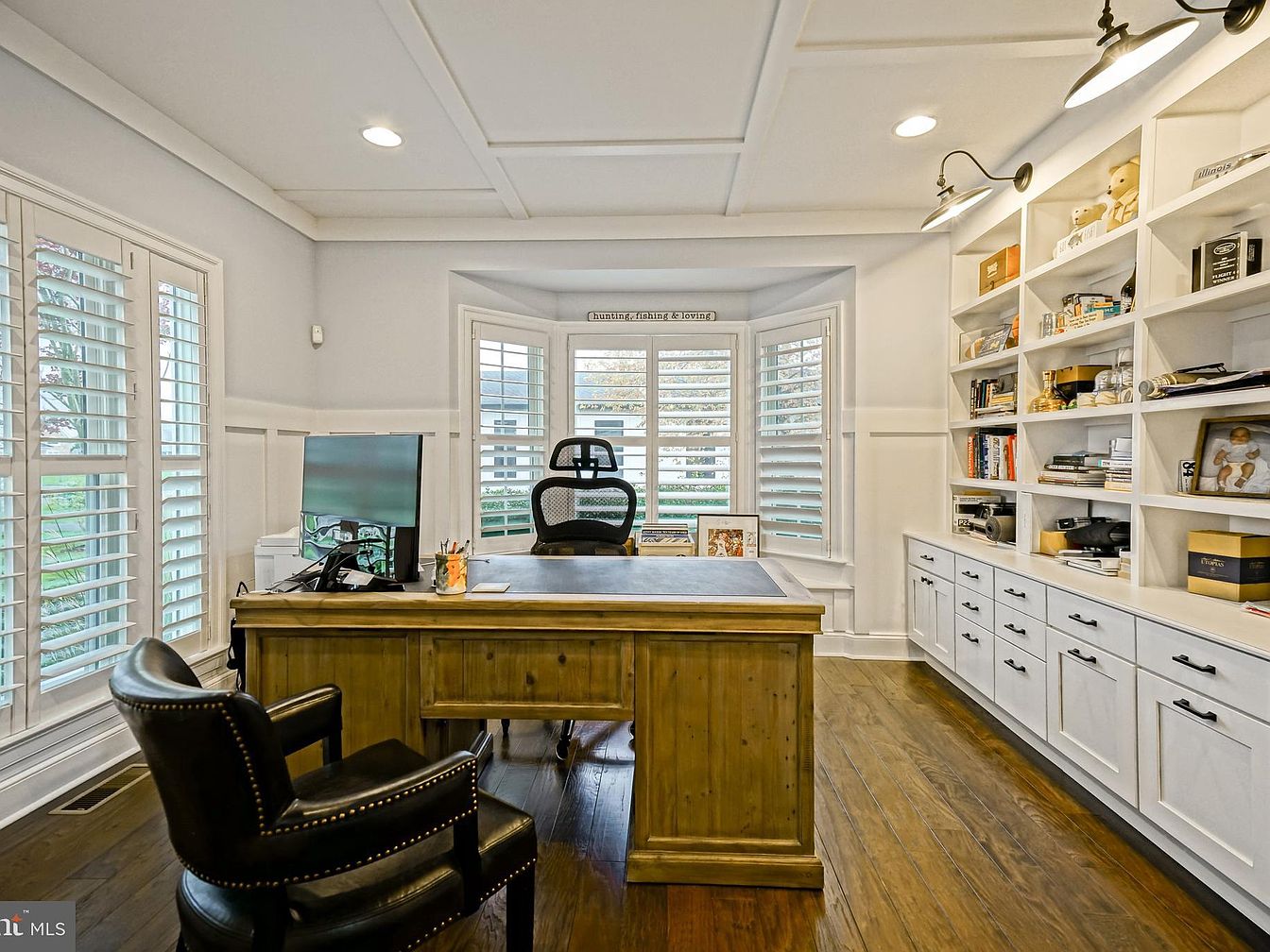 This home office features a sleek design with a spacious layout, highlighted by built-in white shelving that fills one wall, adorned with books, decorative items, and personal memorabilia, providing an organized yet inviting atmosphere. A large monitor sits on a rustic wooden desk, offering a modern touch against the backdrop of traditional architectural elements like coffered ceilings. The room is illuminated by stylish pendant lights, enhancing its functional elegance. Natural light streams through bay windows fitted with white shutters, creating a bright workspace. A plush black leather chair adds comfort, perfectly complementing the hardwood flooring.