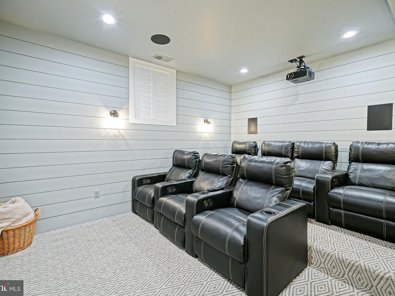 A cozy home theater features plush black leather recliners, arranged in a tiered layout for optimal viewing. The shiplap walls are painted in a soft gray, enhancing the modern aesthetic. A projector is mounted on the ceiling, complementing the minimalistic design, while wall sconces provide warm lighting for ambiance. A large window with plantation shutters allows for control of natural light. The floor is covered with a textured, geometric-patterned area rug, adding comfort and style to the space. A woven basket in the corner holds a cozy throw, inviting relaxation for movie nights.