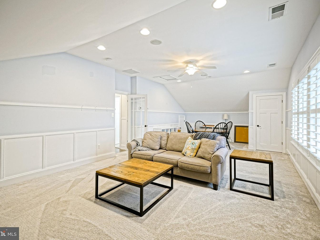 A spacious bonus room featuring a light color palette with soft blue walls and white wainscoting. Natural light streams through large, fitted shutters, enhancing the airy feel of the space. A plush, beige sofa adorned with decorative pillows sits at the center, flanked by two square wooden coffee tables with dark metal bases. Opposite the sofa, a simple dining area includes black, spindle-back chairs surrounding a modest table. The carpet is light and textured, providing warmth underfoot. The ceiling is notched with contemporary recessed lights, and a ceiling fan adds to the room’s cozy, inviting ambiance.