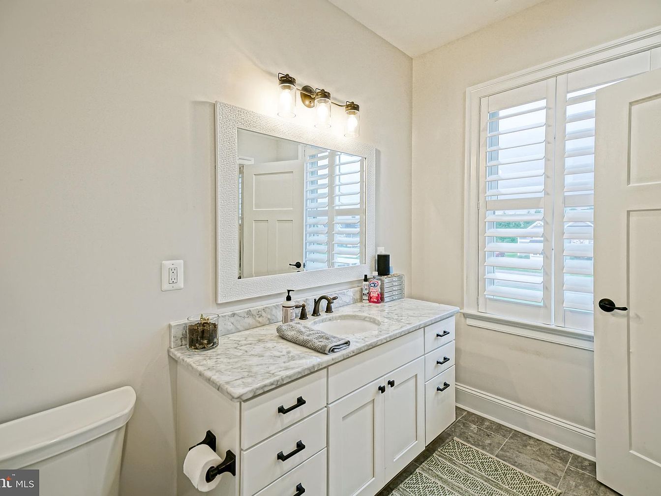 A modern bathroom vanity showcases a clean, minimalist design. A white marble countertop complements the sleek white cabinetry below, featuring black hardware for contrast. Above, a large, framed mirror enhances light and depth in the room, while a stylish light fixture casts a warm glow. The walls are painted in a soft neutral tone, blending seamlessly with the tiled floor in a subtle patterned gray. Plantation shutters filter natural light from the window, adding both privacy and elegance. Decorative elements, like a small plant and neatly arranged toiletries, create an inviting and functional space.