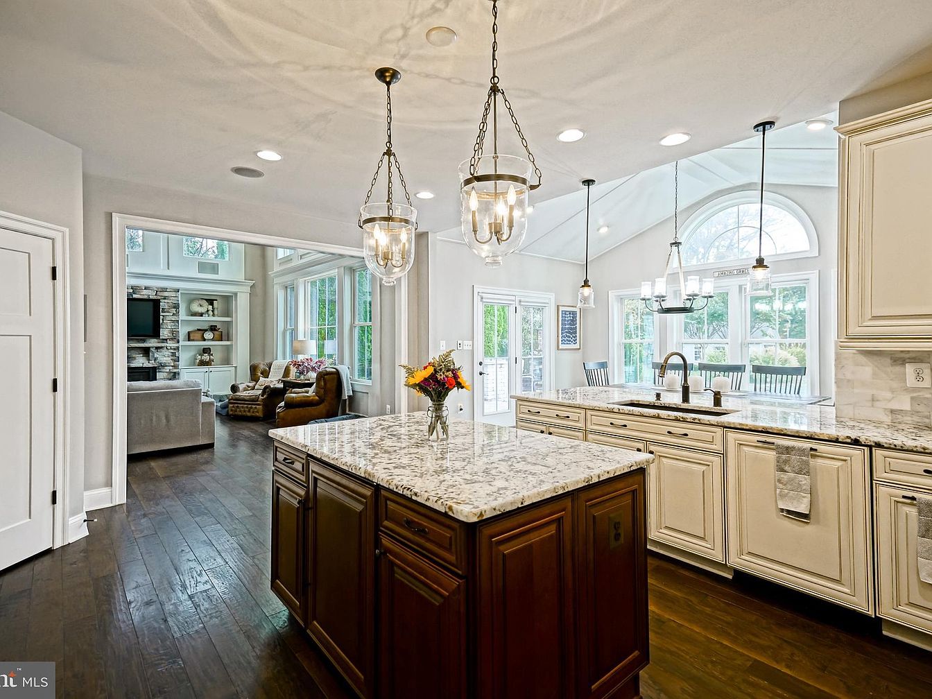 This expansive kitchen features a large island with a rich, dark wood base and a stunning granite countertop, blending elegance with functionality. It showcases light cream cabinetry, providing a soft contrast to the darker tones of the wooden floor. Bright pendant lights hang above the island, casting a warm glow throughout the space. An open layout leads into a bright area with large windows that flood the room with natural light, creating a welcoming atmosphere. The decor includes subtle accents like fresh flowers on the countertop and minimalistic bar stools, enhancing the modern yet cozy feel of the kitchen.