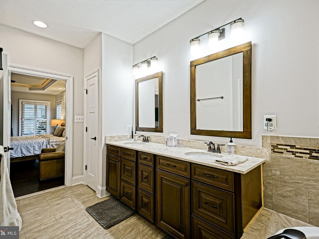 This bathroom features a harmonious blend of modern elegance and functionality. A double vanity with rich wooden cabinetry offers ample storage, topped with a light-colored stone countertop that complements the neutral wall tones. Above the vanity, warm light fixtures illuminate two framed mirrors, enhancing the space’s airy feel. The flooring consists of large, ceramic tiles with a wood-like finish, adding warmth. Just beyond the vanity, an open doorway reveals a cozy bedroom, showcasing a plush bed and natural light filtering through plantation shutters. Subtle mosaic accents on the wall provide an artistic touch, unifying the aesthetic.