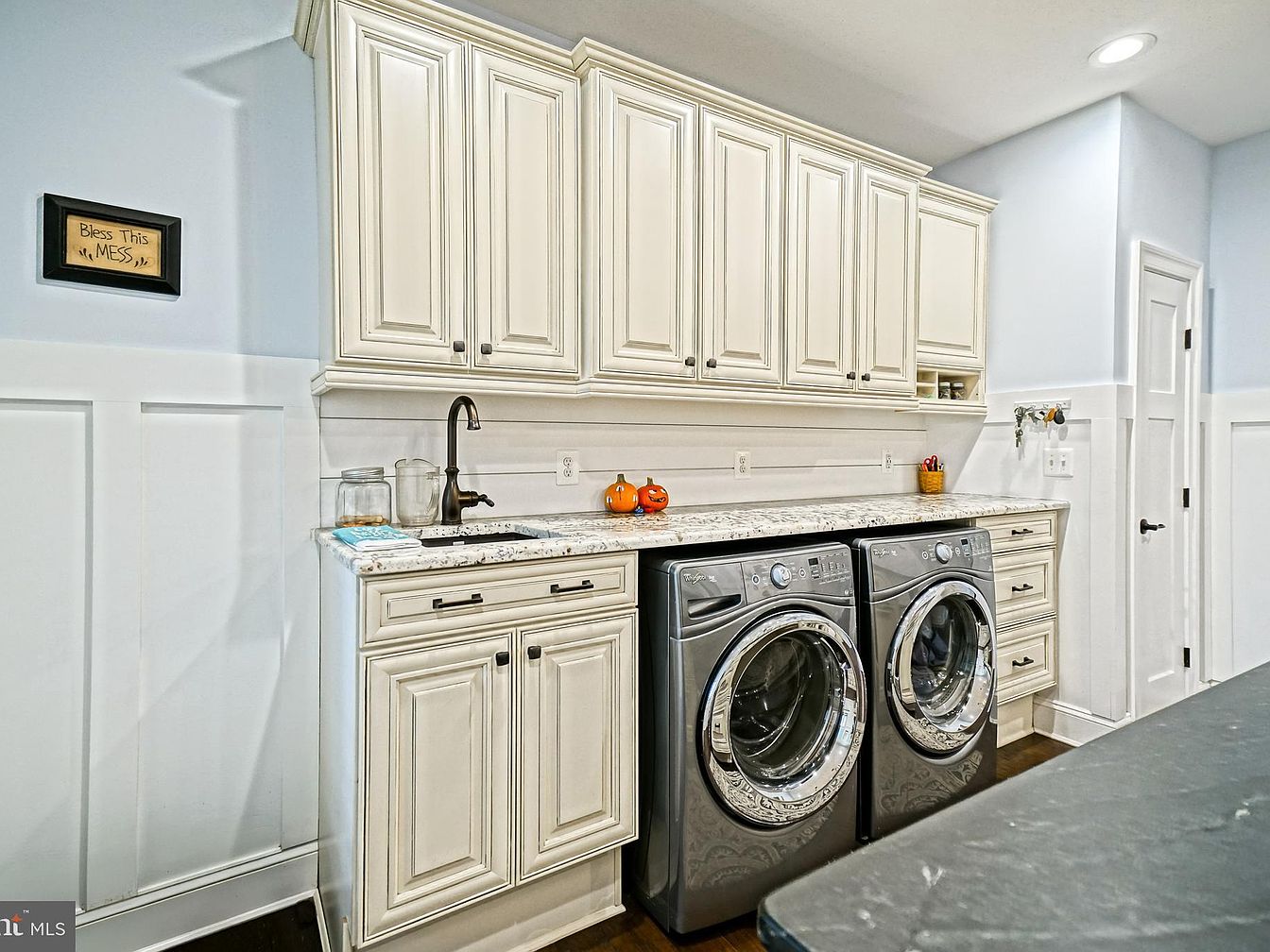 This laundry room features a clean, modern aesthetic with a light color scheme dominated by soft blues and whites. Elegant cabinetry in a creamy finish stands out against the dark granite countertop, offering ample storage space above and below. Sleek, chrome-fronted washing machines add a touch of sophistication, while the intricate detailing on the cabinet doors complements the overall design. A small farmhouse-style sign reading ‘Bless This Mess’ adds a personal touch. The walls, accented with white wainscoting, enhance the room’s spacious feel, contrasting beautifully with dark wood flooring. A brushed metal faucet completes the look.