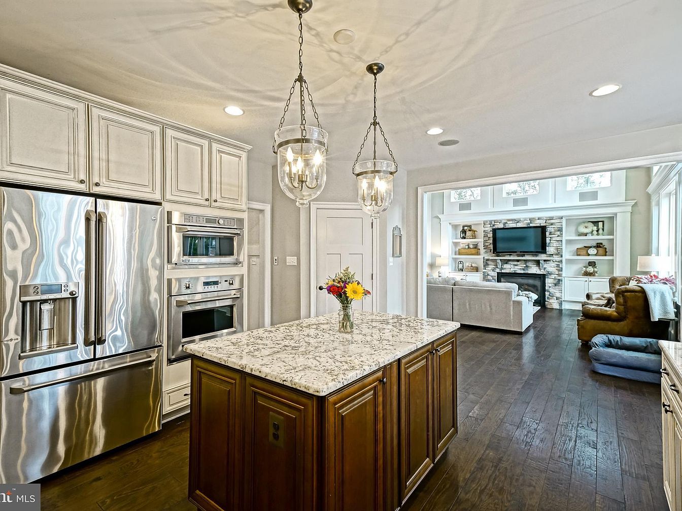 A modern kitchen showcases a large island with a granite countertop, paired with rich wooden cabinetry. The sleek stainless steel appliances are installed seamlessly in a setup that includes a French door refrigerator and dual ovens. Above, elegant glass pendant lights cast a warm glow, enhancing the cozy atmosphere. The space transitions into a bright living area visible through an open archway, featuring a stone fireplace as the focal point, flanked by custom shelving. Light-colored sofas and a brown accent chair create an inviting setting, harmonizing with the dark hardwood flooring that adds a touch of sophistication.
