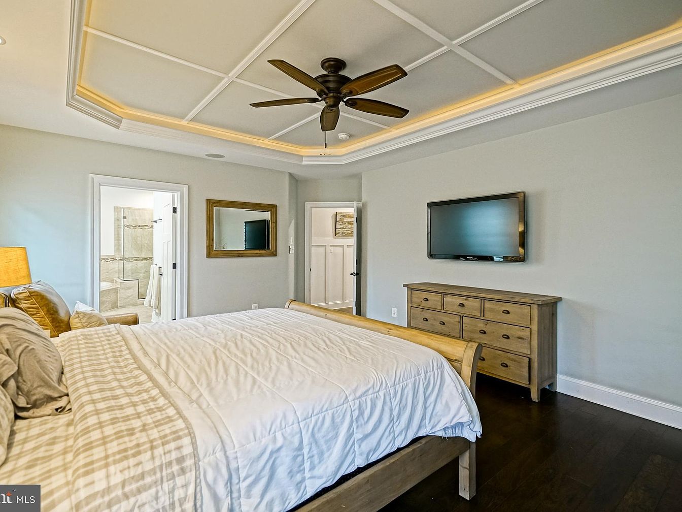 This spacious bedroom features a king-sized bed adorned with a crisp white quilt and gray-striped pillows, providing a serene atmosphere. Light hardwood flooring contrasts subtly with the soft gray walls. A coffered ceiling with integrated lighting enhances the room’s elegance. A wooden dresser with dark handles sits across from the bed, flanked by a wall-mounted flat-screen TV and a decorative mirror. Natural light filters through a window, while a small bedside lamp offers warmth. The doorway on the left leads to a stylish, modern bathroom, seamlessly blending functionality with aesthetic appeal.
