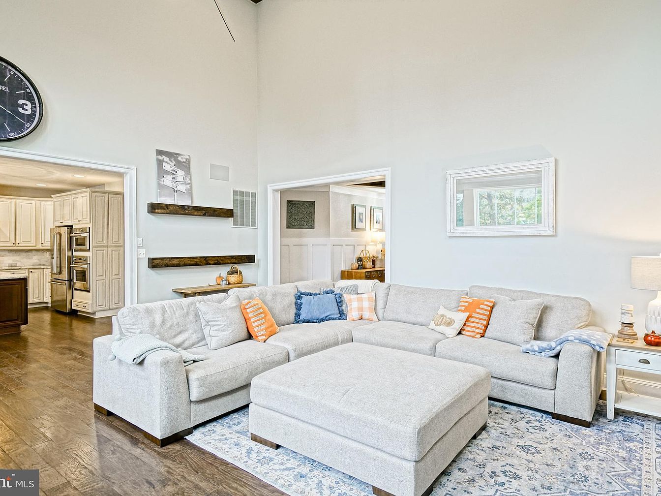 The living room features a spacious layout with a large, light gray sectional sofa at its center, adorned with contrasting orange and blue throw pillows. A neutral area rug with intricate patterns anchors the seating arrangement, enhancing the cozy atmosphere. The walls are painted a soft hue, complemented by tall ceilings and a prominent round clock. To the left, an open doorway leads into the kitchen, visible through a pair of rustic wooden shelves holding decor items. A framed mirror on the wall reflects natural light from the adjacent windows, creating a bright and inviting ambiance.
