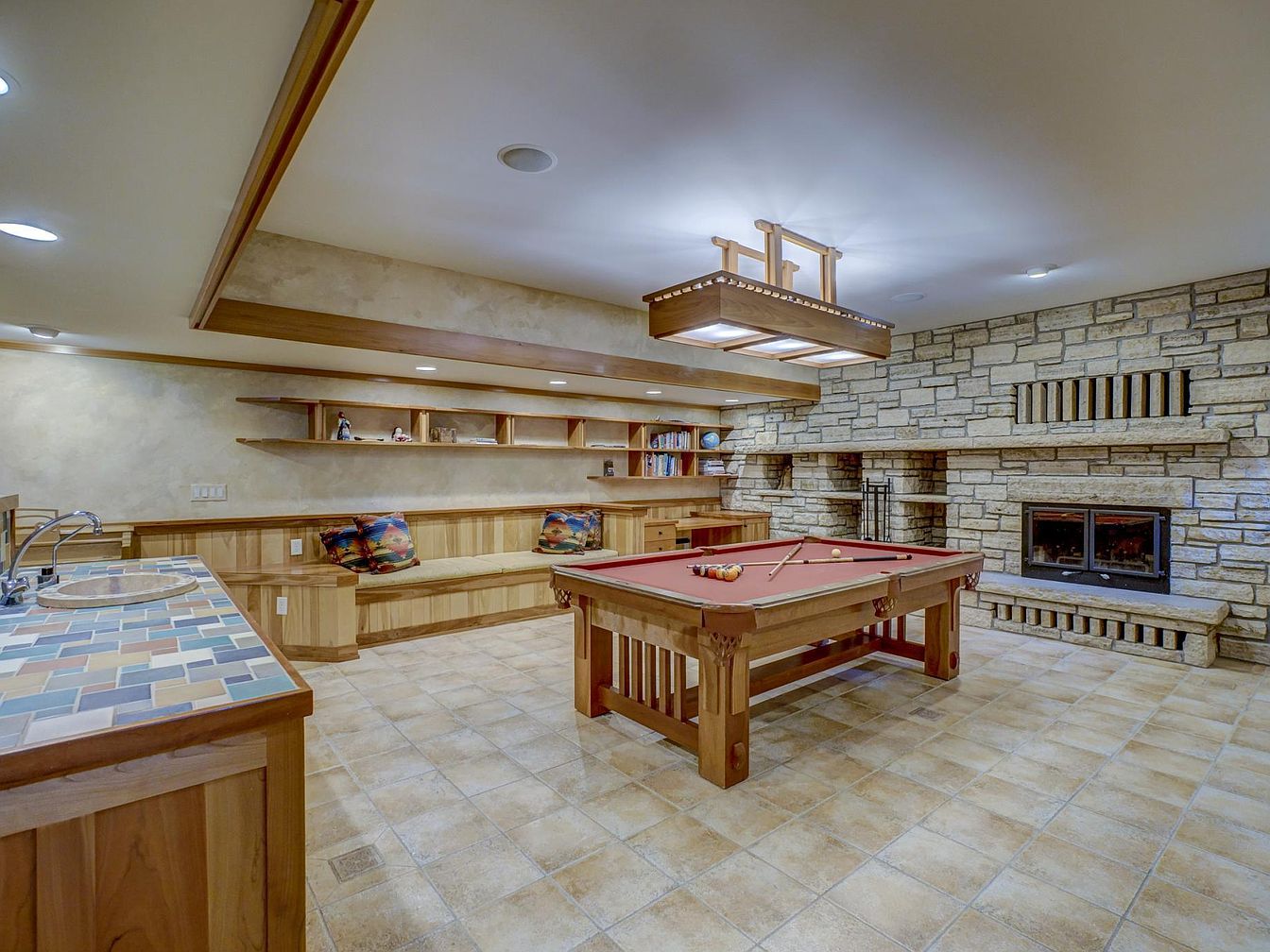 Spacious family-friendly basement game room featuring a warm, neutral color palette with sandy beige tile flooring and soft tan walls. In the center, a wooden pool table under a modern suspended light fixture offers entertainment for all ages. Along one wall, a large built-in wooden bench with colorful throw pillows provides ample seating, perfect for gatherings or playdates. The room includes open shelves for books and games, supporting a family-oriented environment. A rustic stone fireplace adds cozy ambiance, while the small kitchenette with a tiled counter and bar sink makes snacks and drinks easily accessible during family nights.