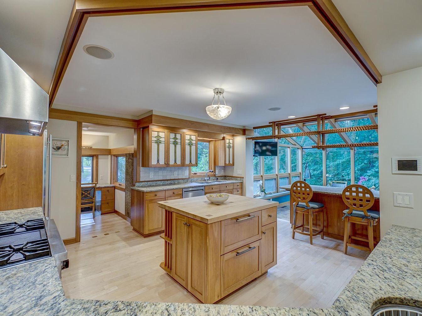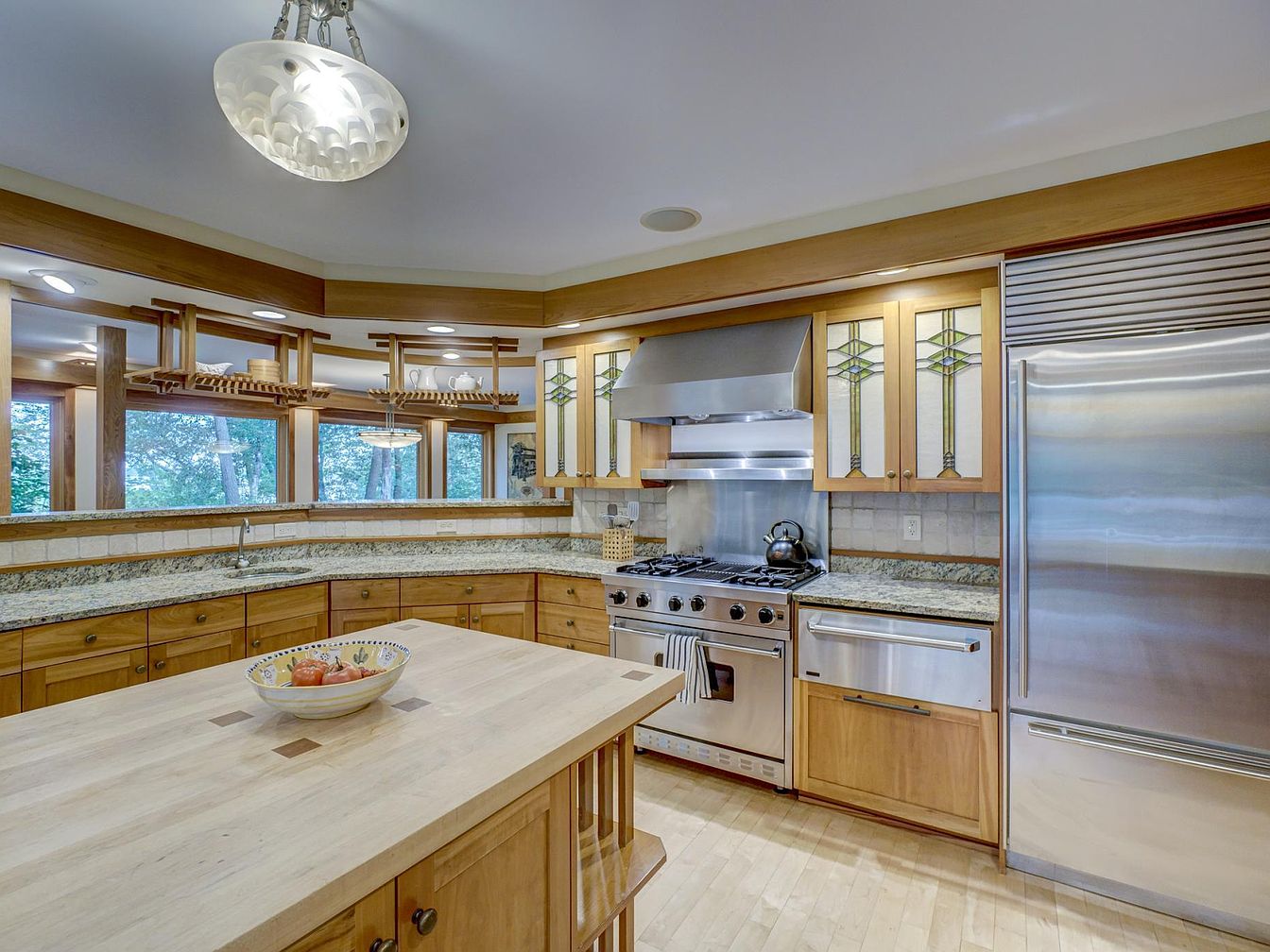 Spacious kitchen area featuring a central wooden island topped with a light wood butcher block surface, perfect for family gatherings and meal prep. Surrounding cabinetry is crafted from warm-toned wood with elegant stained-glass front panels above the stove, adding a touch of classic charm. Stainless steel appliances, including a large range and refrigerator, combine modern convenience with timeless style. Granite countertops wrap around the space, providing ample work area and a double-tiered design for easy supervision of children or casual dining. Large windows bring in natural light and views of trees, creating a bright, welcoming atmosphere for everyday family life.