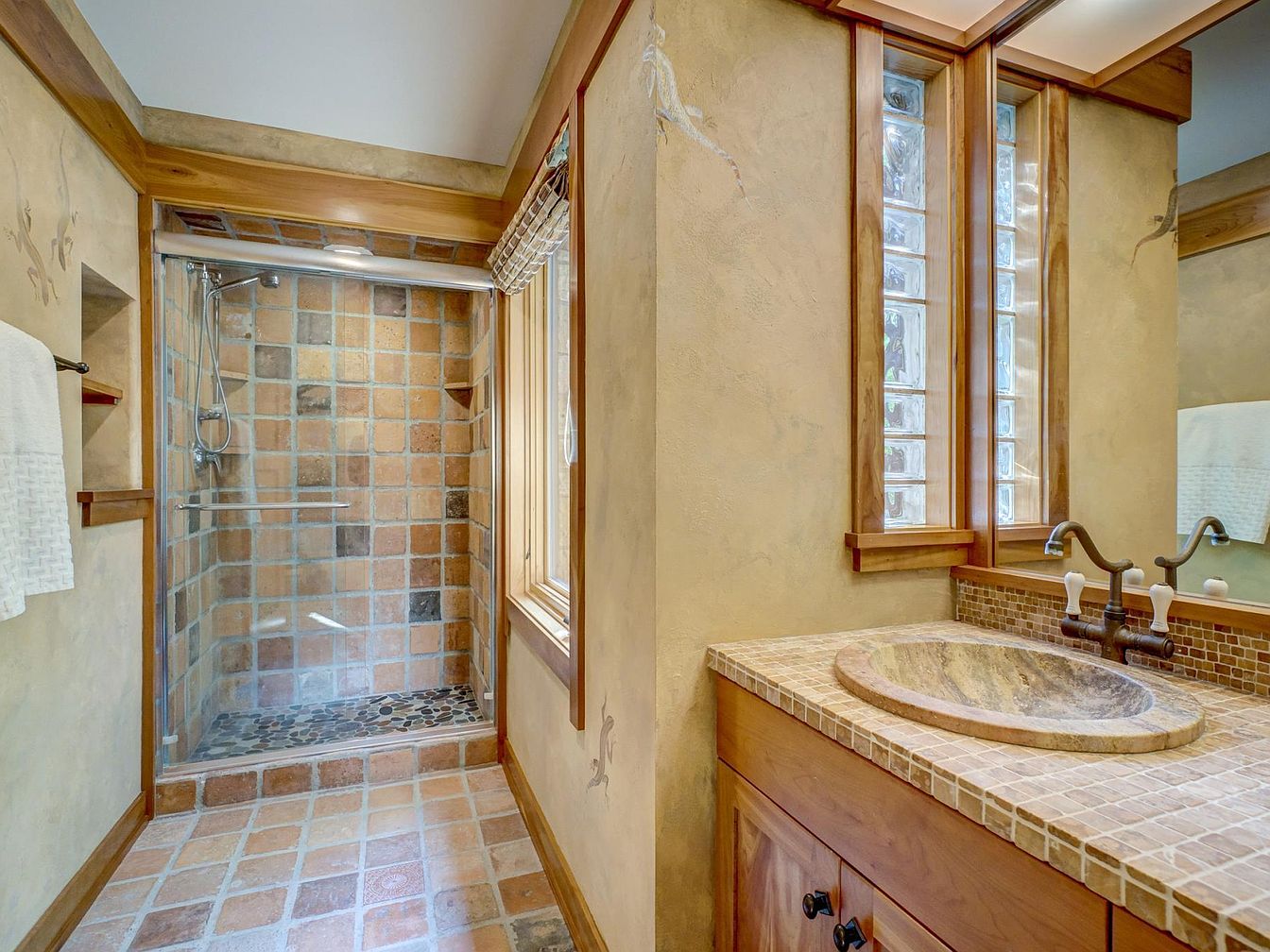 Warm and inviting bathroom featuring earth-toned tiles and natural wood accents. The spacious walk-in shower has tan and brown square tiles, a pebble stone floor, and a sleek glass door for easy access, making it safe and family-friendly. The vanity has a stone sink with a bronze faucet, resting on a matching tile countertop above ample cabinet storage. Vertical glass block windows and a large wooden-framed mirror offer both privacy and natural light. The walls are finished with a textured beige paint, complementing the cozy and rustic feel. Shelves built into the wall offer convenient spots for toiletries and towels.