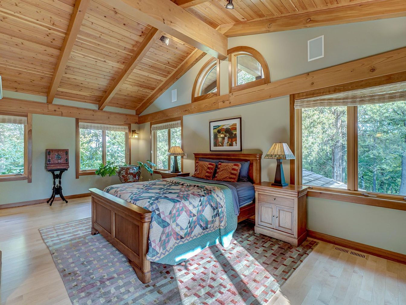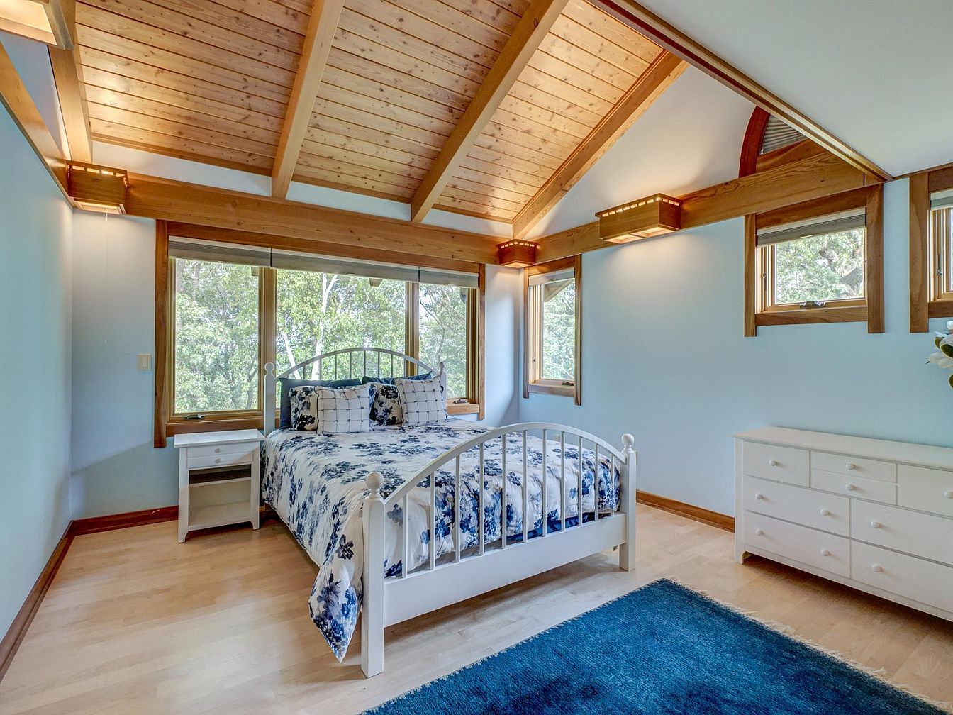 Spacious bedroom featuring a warm wooden vaulted ceiling with exposed beams, creating a cozy, inviting atmosphere ideal for families. The room is filled with natural light from multiple large windows that offer views of surrounding trees, enhancing privacy and a tranquil setting. The centerpiece is a wooden bed with a colorful quilt and several textured pillows, complemented by matching wooden nightstands and artistic lamps. Light hardwood floors with patterned area rugs add comfort and style, while plenty of open floor space allows for play or relaxation. Neutral wall tones paired with natural wood tones complete the welcoming, restful ambiance.