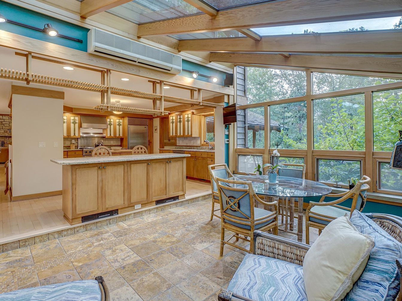 This space combines an open-concept kitchen with a cozy breakfast nook, perfect for family gatherings or casual meals. The kitchen features warm wooden cabinetry, a large granite island with seating, and stainless steel appliances, creating a welcoming and functional atmosphere. The breakfast nook sits beside expansive floor-to-ceiling windows framed in light wood, offering abundant natural light and lush, green views of the outdoors. A glass-topped table surrounded by cushioned chairs is ideal for family-friendly dining, while a casual sofa and armchair with blue and beige textiles add comfort and relaxation to the sun-drenched space. The stone-tiled floor ensures durability for active households.