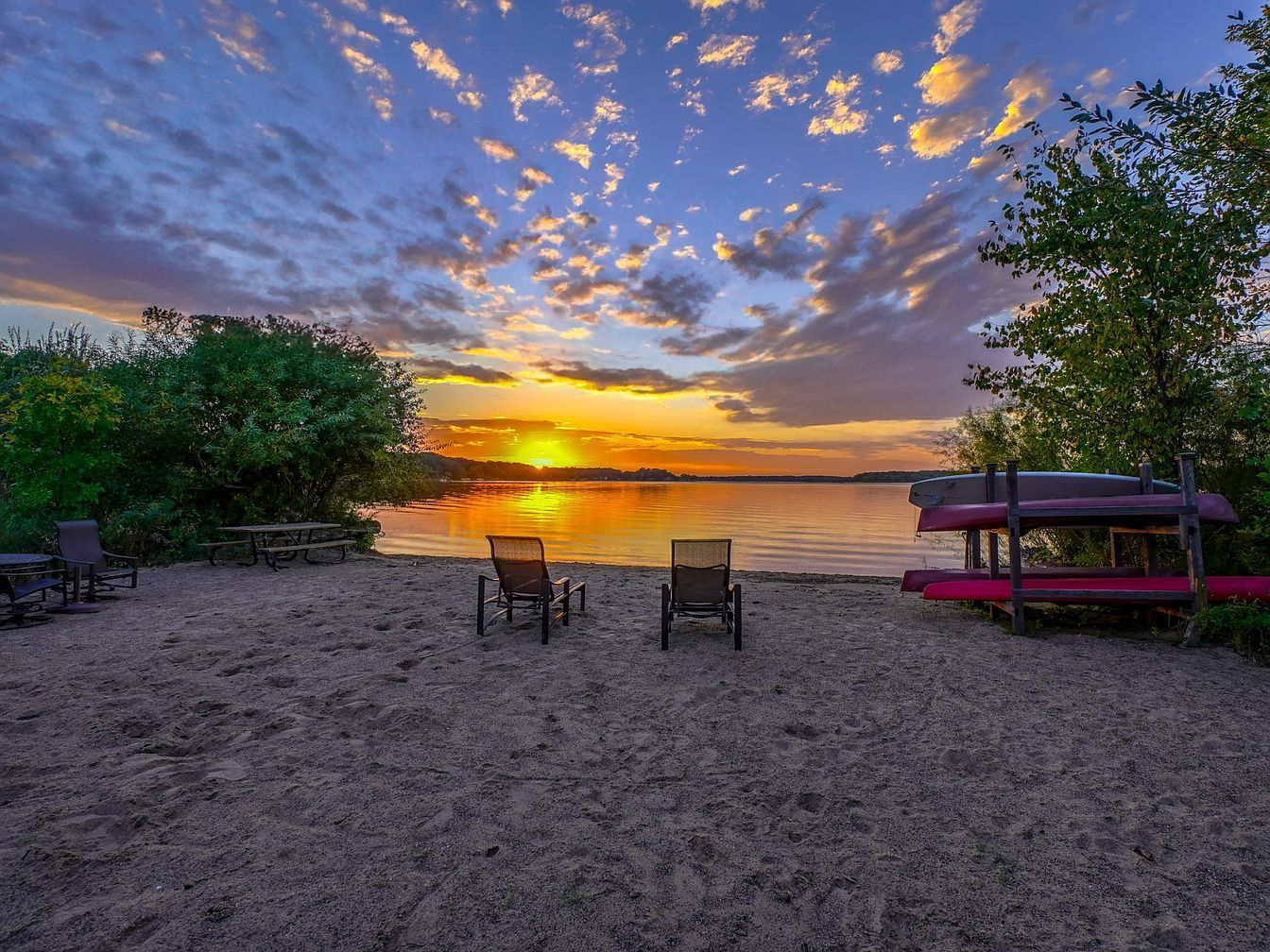 A serene sandy shoreline welcomes families to relax and unwind beside calm, rippling water under a vibrant sunset sky. Two lounge chairs face the glowing horizon, perfect for watching sunsets together. A picnic table sits nestled among green bushes, offering a spot for outdoor family meals. On one side, several kayaks rest neatly in a wooden rack, encouraging family adventures and water play. The setting is framed by leafy trees that create a private, natural retreat. The beach area is spacious, inviting children to build sandcastles and adults to enjoy the peaceful ambiance, making it an ideal family-friendly outdoor oasis.