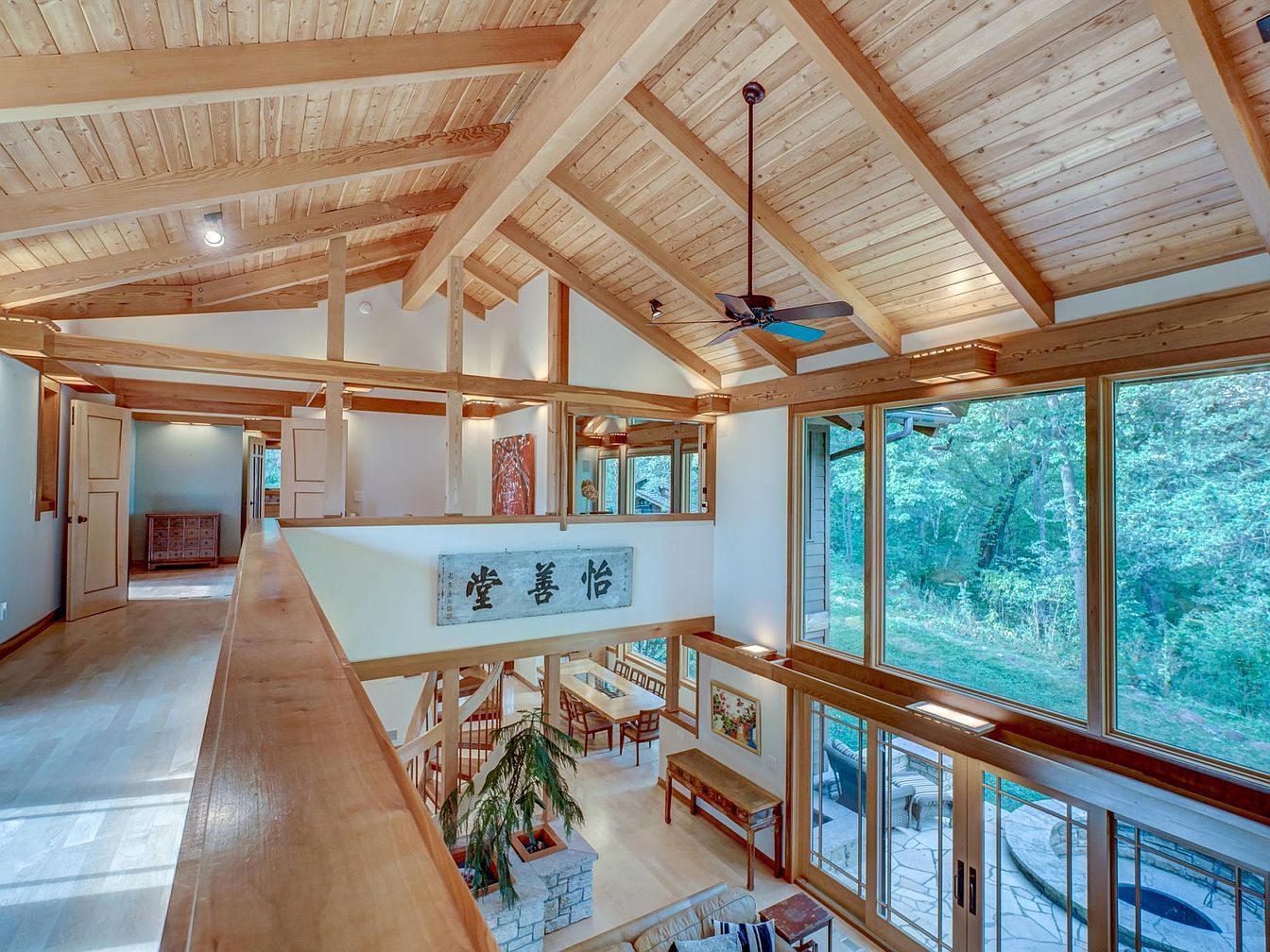 This open upstairs landing features warm, honey-toned wood beams and vaulted ceilings that create a sense of spaciousness and comfort. Natural light floods the space through expansive floor-to-ceiling windows overlooking lush greenery, making it perfect for watching kids play outside or relaxing with the family. The light wood floors and walls enhance the bright, airy feel, while architectural details like a ceiling fan and exposed beams add rustic elegance. The landing is wide and safely enclosed by a wooden railing, making it ideal for children and offering easy access to adjoining rooms. Its open design promotes visibility and togetherness throughout the home.