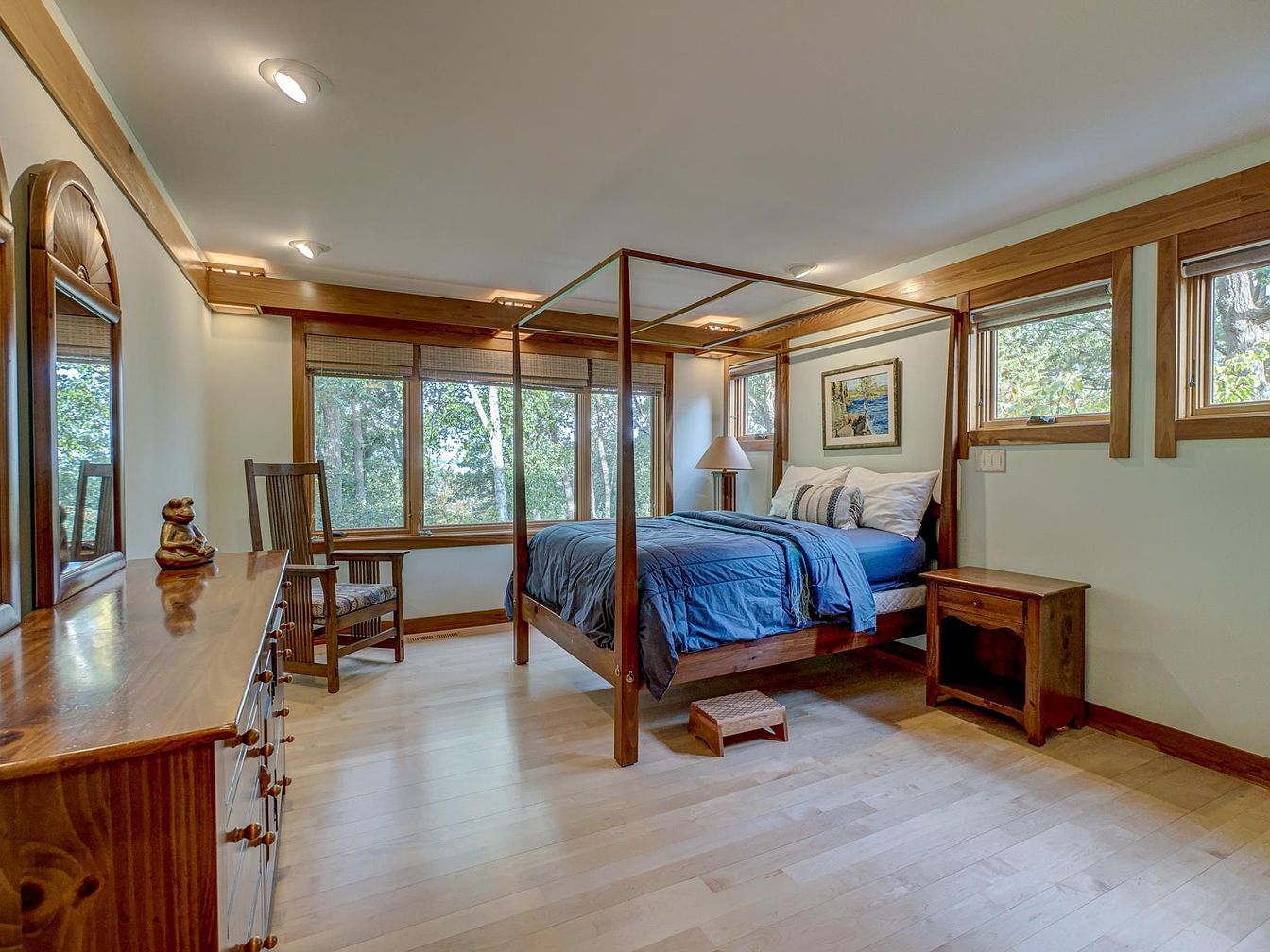 Spacious master bedroom filled with natural light from a row of large windows overlooking a leafy outdoor view, creating a serene and inviting atmosphere ideal for families. The centerpiece is a wooden four-poster bed dressed in a rich blue comforter and white pillows, providing a cozy spot for relaxation. Light-colored hardwood floors and matching wooden trim add warmth and continuity throughout the space. A sturdy wooden dresser with a mirror, a classic wooden chair, and a simple side table help maintain a clean, uncluttered look, while soft lighting from ceiling fixtures offers comfort and calm both day and night.