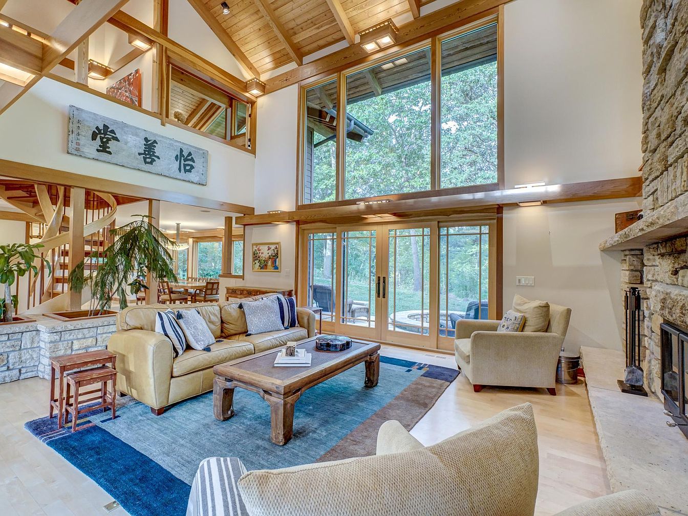 Spacious, open-concept living room featuring a vaulted wood-paneled ceiling and floor-to-ceiling windows that offer expansive wooded views and abundant natural light. The room centers around a large stone fireplace, adding warmth and a cozy family gathering spot. Soft tan and beige furnishings, including a plush leather sofa and fabric armchairs, create inviting seating areas around a rustic wooden coffee table atop a blue and gray area rug. Indoor greenery and carefully chosen artwork add personality and color, while the open layout connects seamlessly to the dining area and showcases a striking spiral staircase, making it ideal for entertaining and family activities.