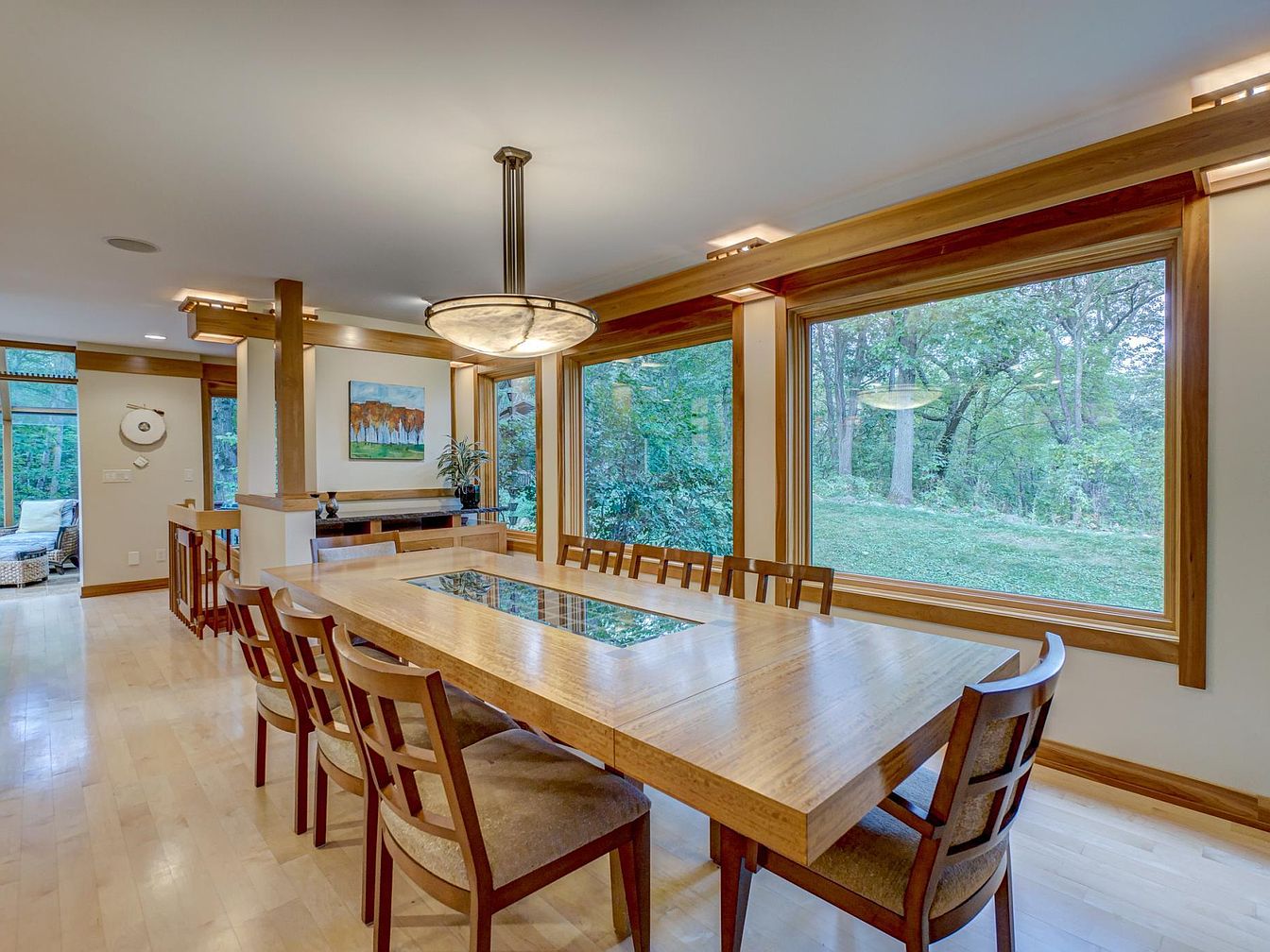 A spacious dining room features a large wooden table with seating for eight, ideal for family meals and gatherings. The room is surrounded by expansive windows that let in abundant natural light and offer serene views of a lush, wooded backyard, bringing nature right into the home. Soft beige walls, light maple hardwood floors, and warm wood trim give the space a contemporary yet cozy feel. An elegant pendant light hangs above the table, and a sideboard with decorative accents and artwork completes the look. Open sightlines to adjacent living areas make this a versatile, family-friendly space.