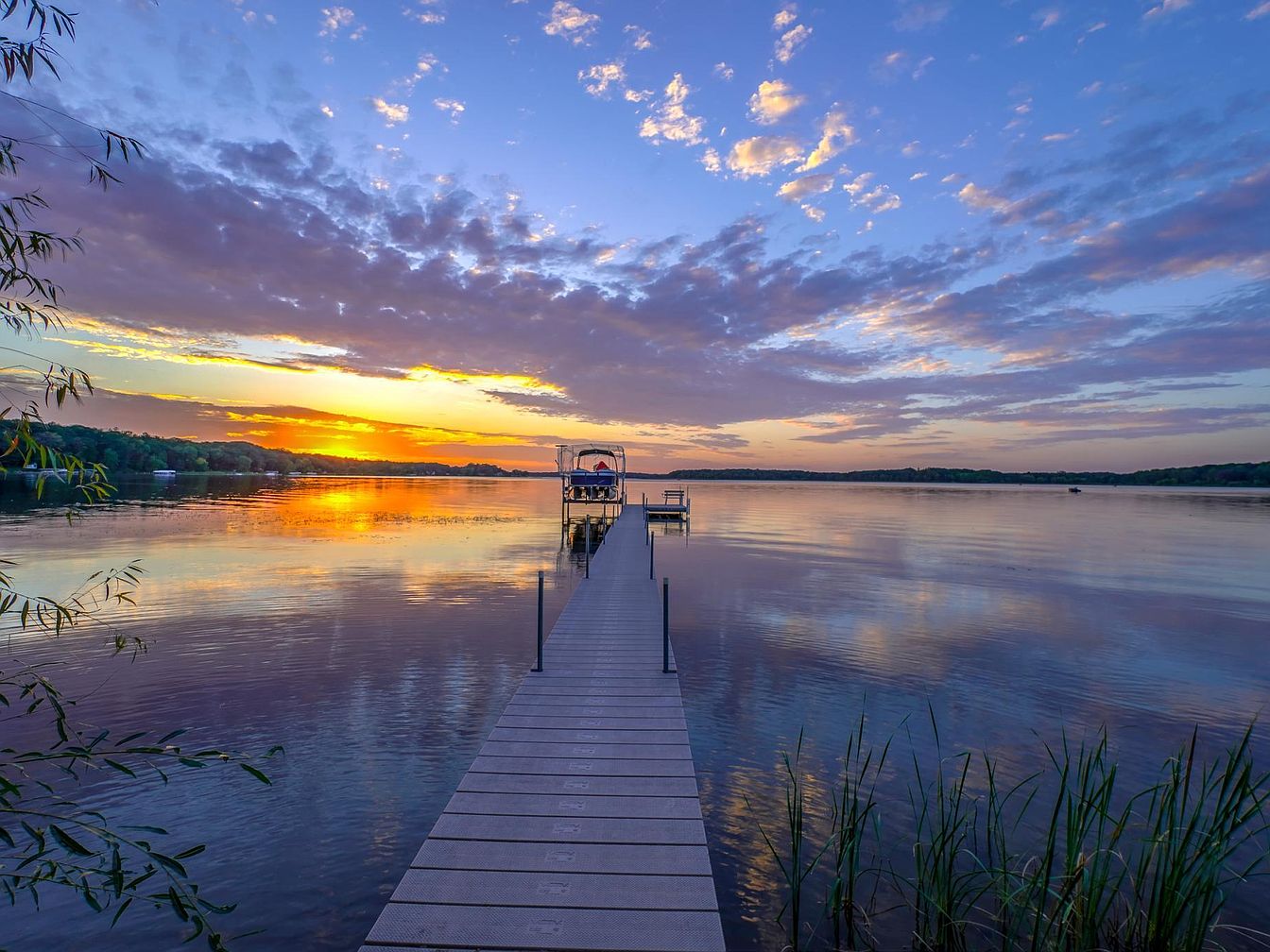 A long, sturdy wooden dock stretches out over a tranquil lake, leading towards a covered boat slip at the end, perfect for family outings and water activities. The scene is bathed in warm hues from a vibrant sunset, with golden and orange reflections shimmering across the calm water. Wispy clouds scatter across a blue and lavender sky, creating a peaceful backdrop. Lush green reeds frame the dock, enhancing the natural beauty. This inviting outdoor space is ideal for family gatherings, fishing, or quiet evenings, encouraging connection with nature and providing plenty of space for safe, memorable waterfront adventures.