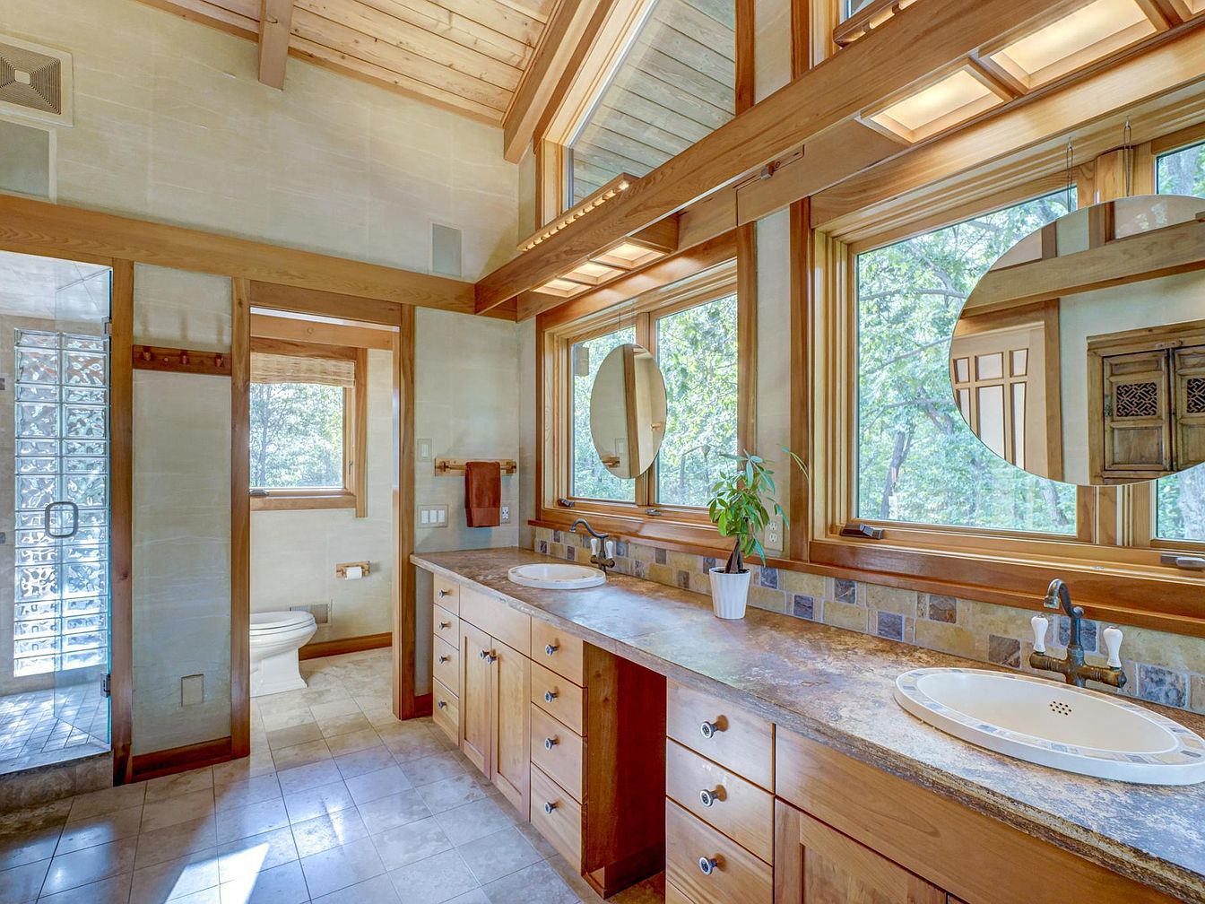 Spacious bathroom with a double sink vanity and large windows letting in ample natural light, creating a bright and welcoming atmosphere. Natural wood cabinetry and trim complement the neutral tile flooring and stone countertops, emphasizing a warm, organic aesthetic. The layout includes a separate walk-in shower with glass block walls for privacy, and a private toilet nook with its own window. Two large round mirrors hang above the sinks, adding modern flair. Family friendly features include ample storage space in drawers and cabinets, easy-to-clean surfaces, and an open layout ideal for shared use during busy mornings.