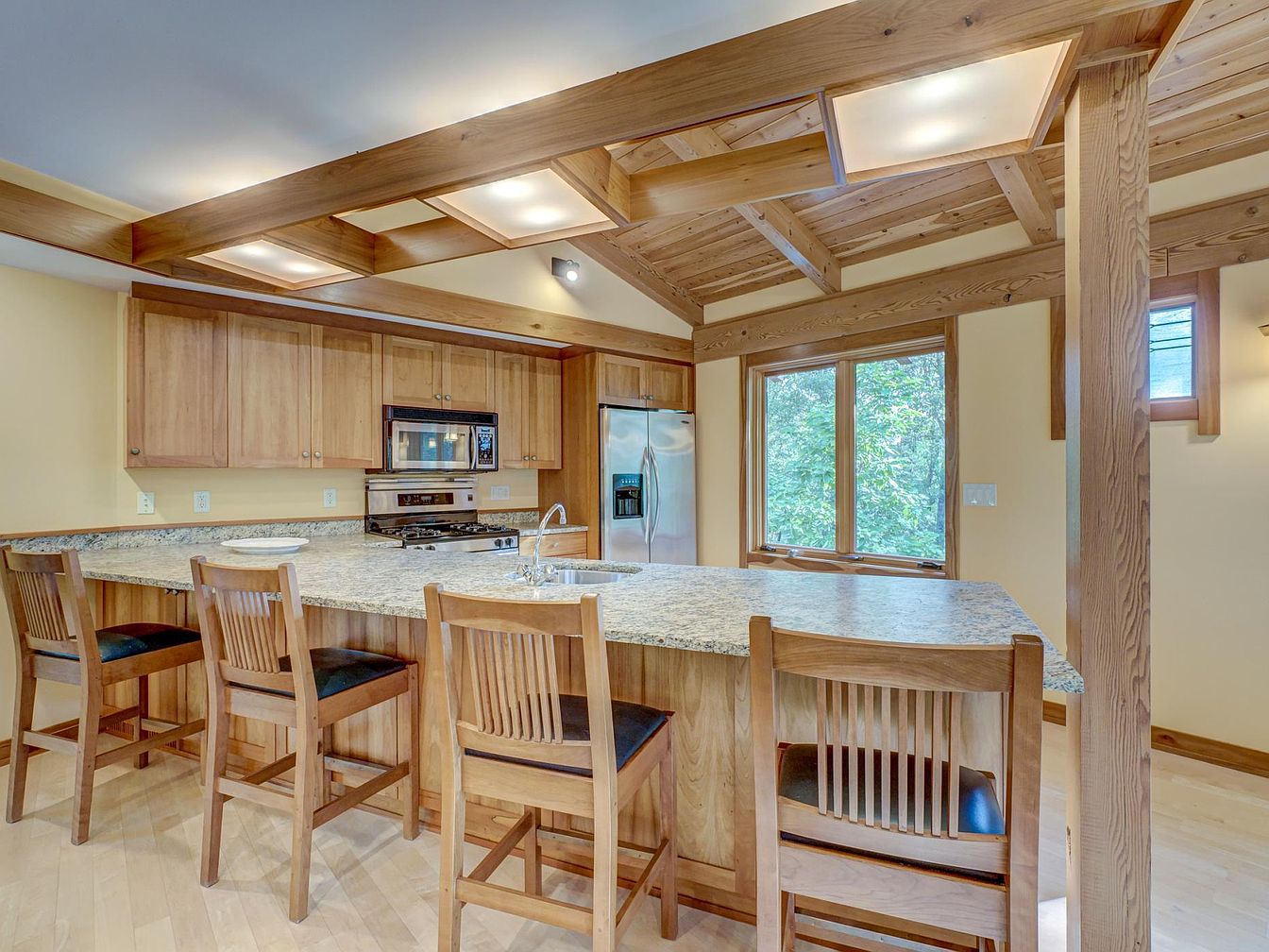 A spacious kitchen features a large central island topped with speckled granite, offering plenty of seating with four matching wooden chairs, perfect for family gatherings or casual meals. Warm wood cabinetry lines the back wall, pairing beautifully with stainless steel appliances and providing abundant storage. Natural wood accents continue across the coffered ceiling and exposed beams, adding an inviting rustic charm. Soft beige walls, large windows flooding the space with natural light, and smooth hardwood floors create an open, airy feeling. The layout encourages interaction and safety for families, with easy movement and clear sightlines for supervising children.