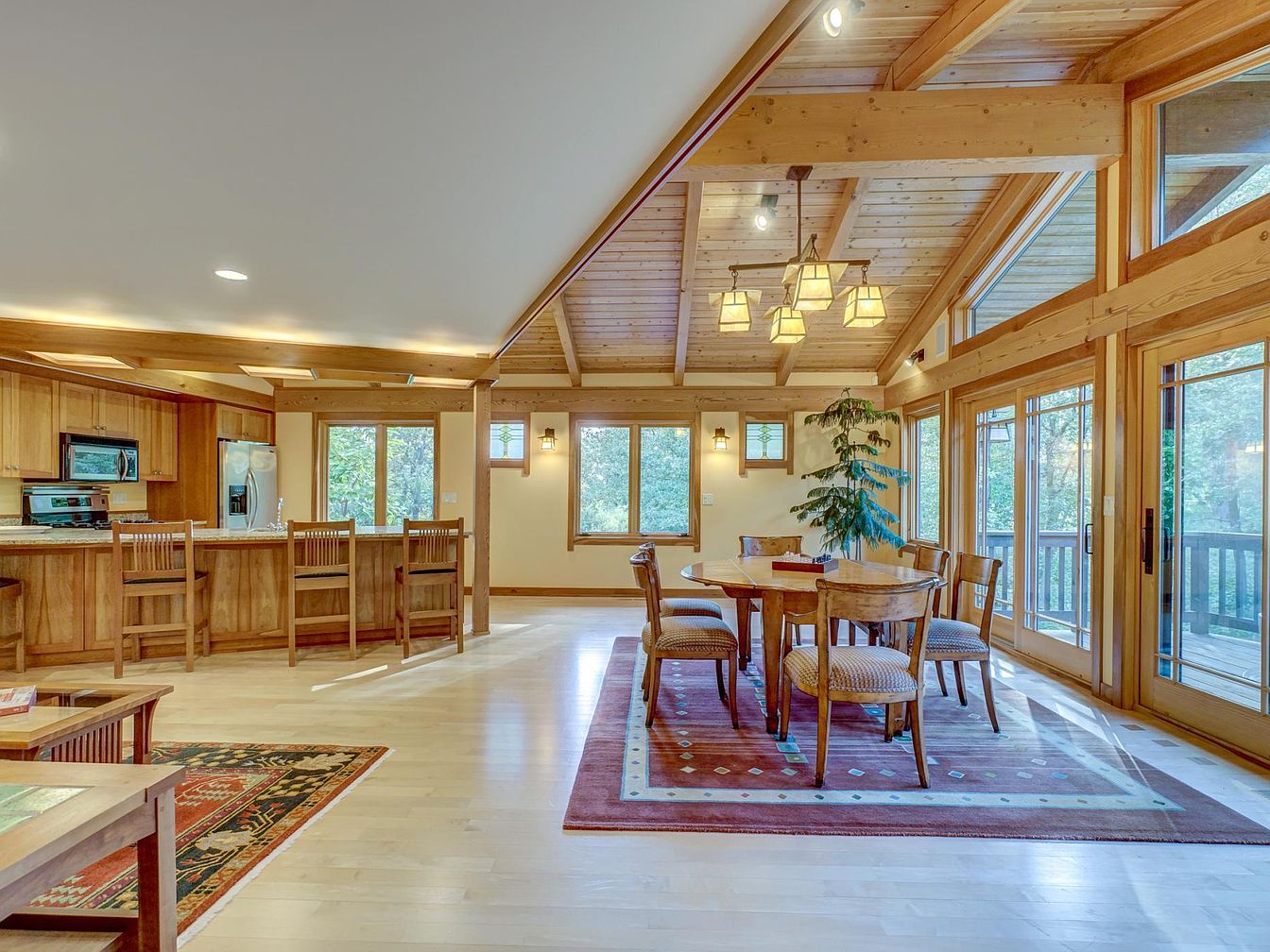 Spacious, open-concept dining and kitchen area features natural wood beams, vaulted ceiling, and large windows letting in abundant daylight. The dining area centers around a sturdy wooden table with six cushioned chairs arranged atop a patterned rug, ideal for family meals or gatherings. Adjacent sliding glass doors open to a deck, providing seamless indoor-outdoor living. The kitchen boasts granite countertops, warm wooden cabinetry, and a breakfast bar with high-back wooden stools, perfect for casual dining or helping kids with homework. Soft neutral walls, subtle recessed lighting, and leafy views foster a comfortable, family-friendly atmosphere filled with warmth and light.