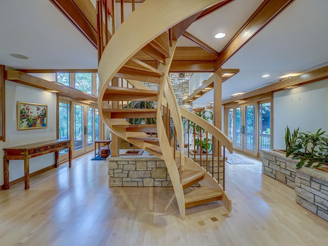 A striking spiral staircase made from light-colored wood serves as the centerpiece, seamlessly connecting the open-concept living space. The staircase is surrounded by floor-to-ceiling windows that bring in abundant natural light, making the area bright and inviting for families. Warm wooden beams line the ceiling, creating a cozy and welcoming atmosphere. Built-in stone planters with lush green plants and stone accents on the walls further enhance the earthy, organic feel. Sleek wooden floors pair with stylish furniture, such as a classic console table and vibrant artwork, combining tasteful decoration with practical, family-friendly living. Multiple glass doors provide easy access to a spacious outdoor area.