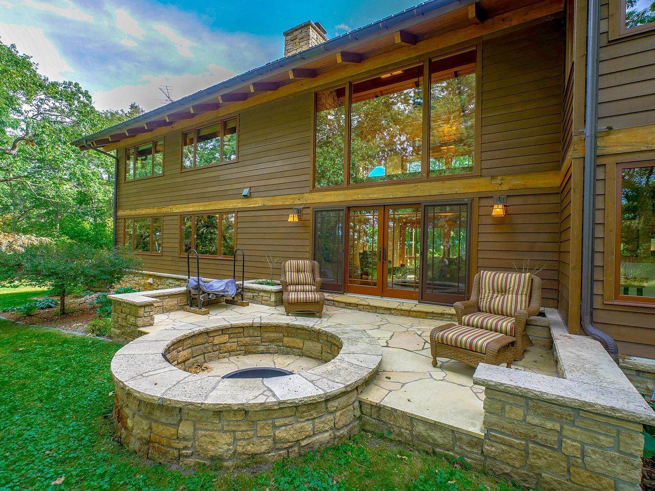 A spacious backyard patio features a built-in stone firepit surrounded by a circular stone seating wall, perfect for gatherings and family nights. Two comfortable wicker chairs with striped upholstered cushions and a matching ottoman provide stylish seating, blending seamlessly with the natural outdoor setting. The patio is surfaced with large stone tiles and bordered by lush green grass and mature trees, offering a tranquil environment. The home’s exterior showcases warm brown wood siding, expansive windows, and glass doors that connect indoor and outdoor spaces, maximizing natural light and offering pleasant views, ideal for families seeking relaxation and entertaining opportunities.