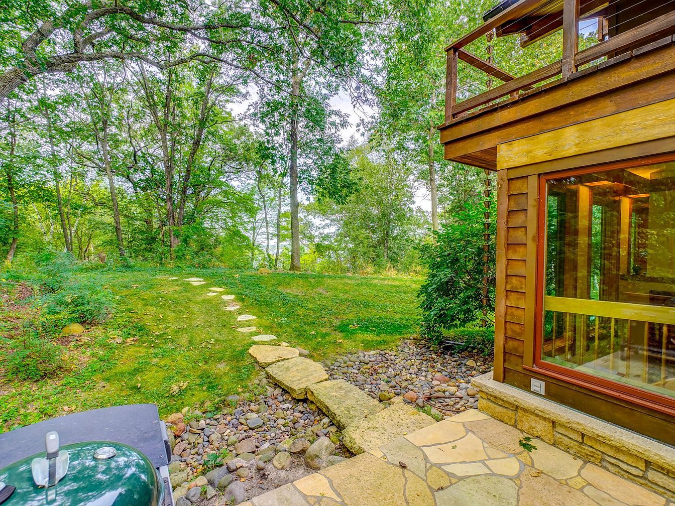 A scenic backyard space features a gentle stone pathway curving through a green, grassy lawn, leading towards a wooded area perfect for exploration or family play. The right side of the image reveals part of the home’s exterior, showcasing warm wooden siding paired with large, reflective windows and a rustic stone patio. Mature trees cast dappled shade across the yard, providing natural cooling and privacy, while the open view and grassy area offer abundant space for children to play safely. The earthy color palette of greens, browns, and yellows creates a cozy, inviting atmosphere, ideal for outdoor gatherings or quiet relaxation.