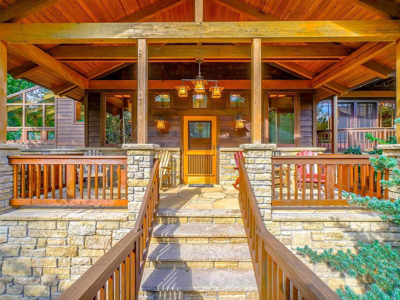 Warm natural wood and sturdy stone are showcased on this welcoming front porch entryway, featuring wide steps lined with handsome wooden railings. The covered porch creates a sheltered, inviting entrance perfect for families, offering safety and comfort in all seasons. The architecture blends traditional American craftsman style with exposed wooden beams and shingle siding, while soft golden light from hanging lanterns casts a cozy glow over the space. Seating areas with Adirondack chairs on either side provide a relaxing spot for family gatherings or watching children play, surrounded by greenery and large windows that let in natural light.