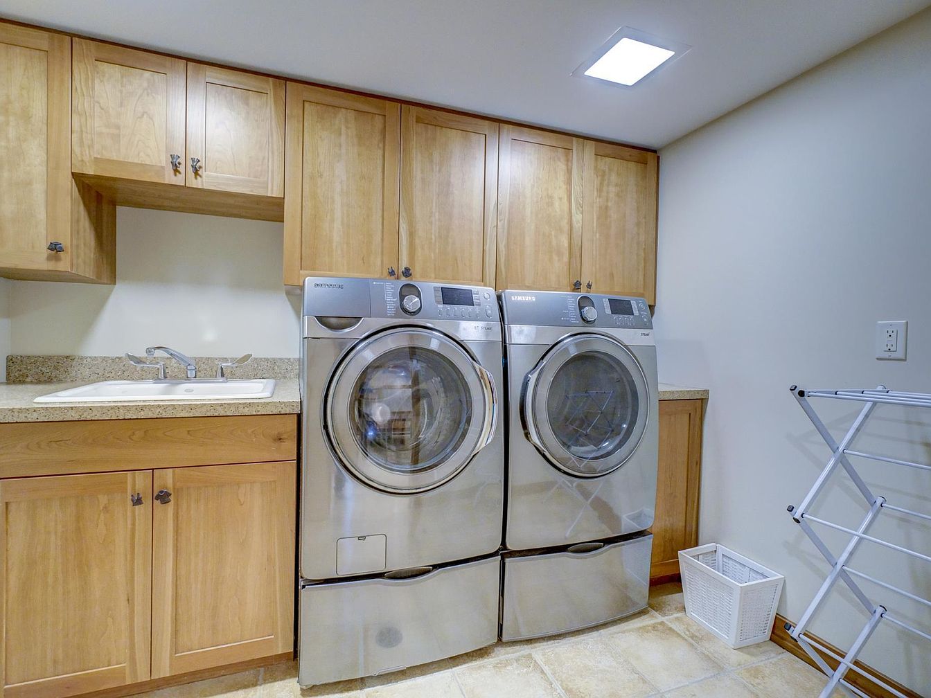 This spacious laundry room features modern front-loading washer and dryer units in stainless steel, conveniently placed side by side for easy access. Above and below the appliances, an abundance of natural wood cabinets offer ample storage space for laundry supplies, helping to keep the area tidy and organized. A sturdy countertop includes an integrated sink, ideal for hand washing delicate items or tackling messy stains. Light beige tile flooring and soft cream-colored walls create a bright, welcoming atmosphere, while a ceiling light provides excellent illumination. A collapsible drying rack and laundry hamper in the corner make this room especially practical for busy families.