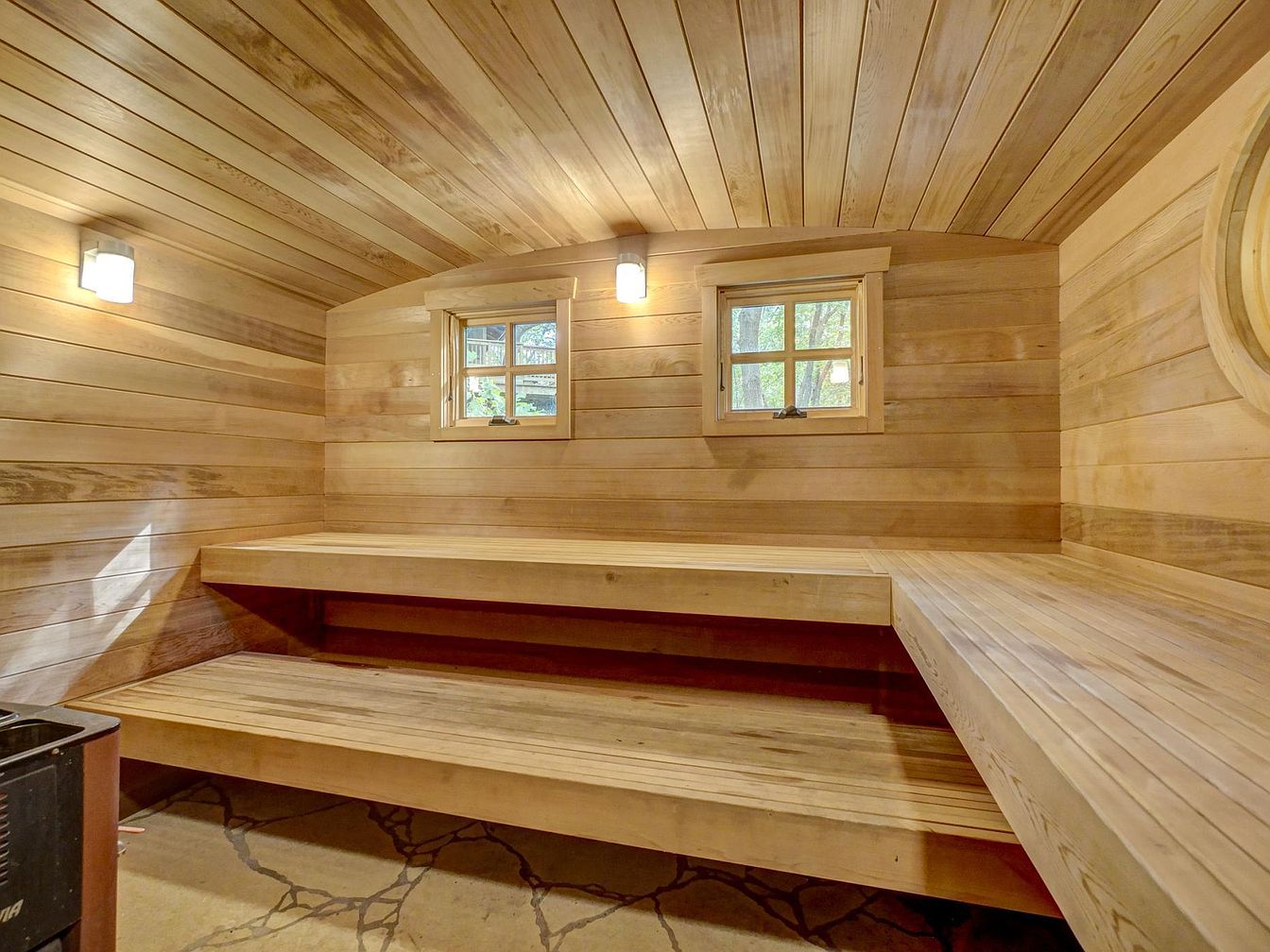 Warm wood planks line the walls and ceiling in this spacious, inviting sauna room, creating a serene atmosphere ideal for relaxation and family bonding. The room features two wide, tiered wooden benches that wrap around the walls, offering plenty of seating for multiple family members. Three small windows, each framed in matching wood, let in natural light, and two wall-mounted lights provide a soft, calming glow. The minimalist design and natural wood tones promote a soothing, restful experience. Rounded corners and smooth surfaces ensure safety, making it a perfect space for families seeking wellness within their home environment.