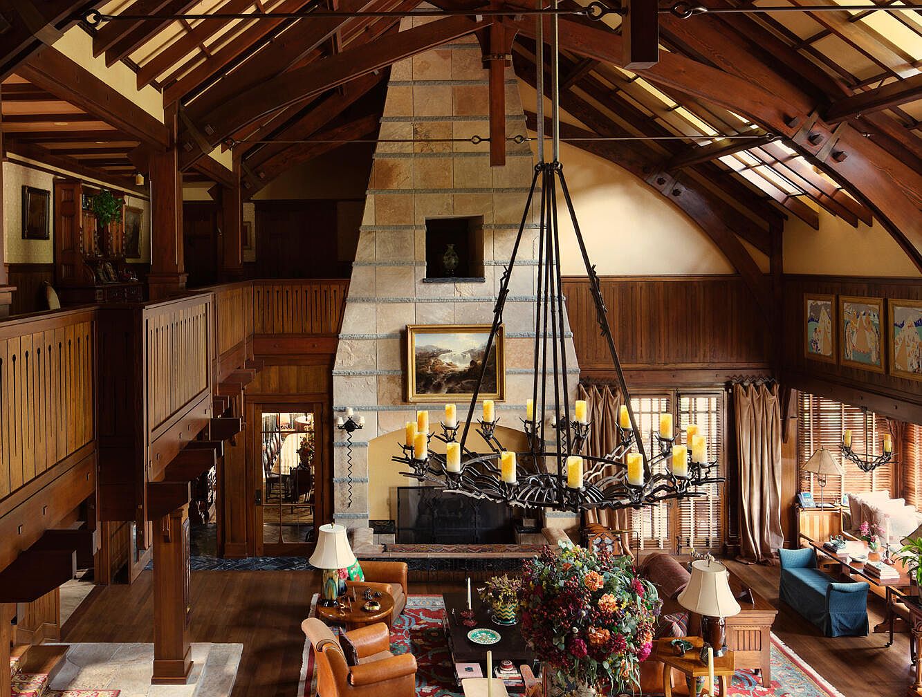 This spacious great room features a high, vaulted ceiling supported by exposed wooden beams. The color scheme combines rich browns from the wood with warm neutral walls, highlighting the rustic ambiance. A large stone fireplace serves as the focal point, with a mounted painting above it. Elegant chandeliers hang from the ceiling, emitting a soft glow. Tasteful furniture includes comfortable sofas in orange and blue hues, arranged around a round wooden table, ideal for gatherings. Ornate floral arrangements add vibrancy, while large windows with wooden blinds frame the room, providing natural light and a cozy atmosphere.