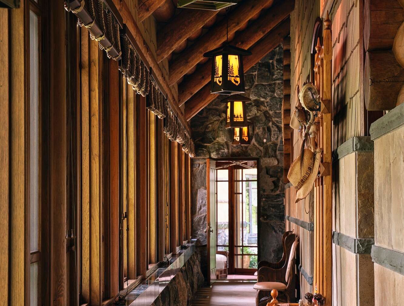 This hallway showcases a warm, rustic design with a combination of stone and wood elements. The walls are predominantly made of stone, providing a sturdy, organic texture, while wooden beams across the ceiling create an inviting atmosphere. Tall, narrow windows line one side, allowing natural light to filter in, enhancing the rich tones of the wood. The space is accented by decorative lanterns hanging from the ceiling, adding character and a soft glow. Along the walls, rustic decor, such as hats and handcrafted items, contribute to the homey feel, inviting guests to engage with its history.