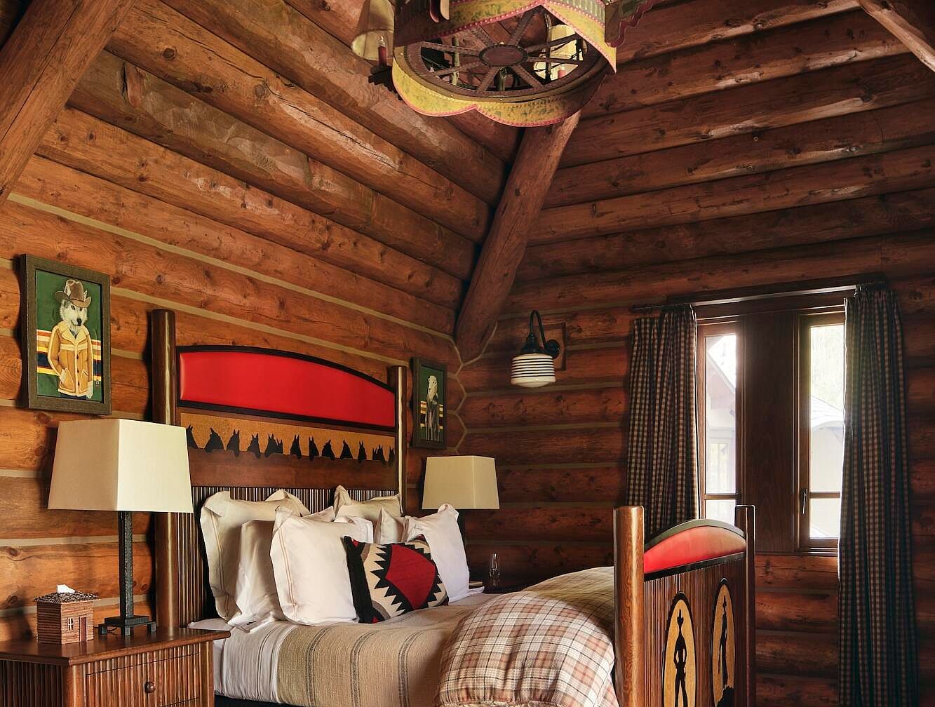 This cozy bedroom features warm wooden log walls, emphasizing a rustic aesthetic. The centerpiece is a striking bed with a bold red headboard and intricate designs, complemented by layered white bedding and a decorative black and red throw pillow. On either side, stylish lamps illuminate the space, enhancing the inviting atmosphere. Artwork of cowboy figures adorns the walls, adding character. Large windows with plaid curtains let in natural light and offer a view outside. The sloped ceiling, accented with exposed beams, completes the cabin-like ambiance, making the room feel both intimate and uniquely charming.
