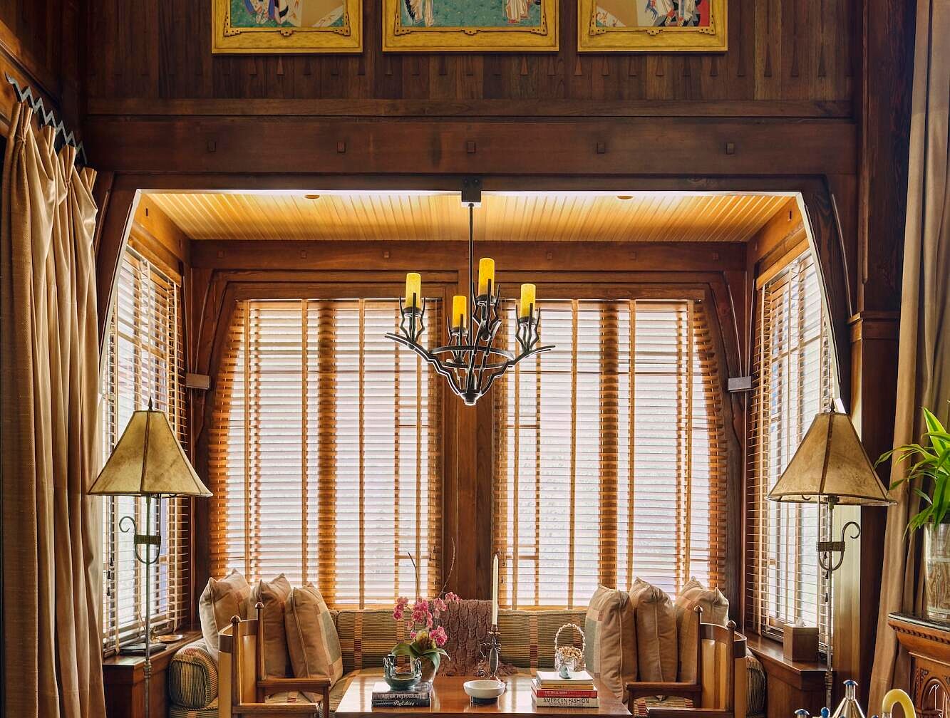 This cozy sunroom features rich wooden paneling that adds warmth and character. Natural light floods the space through large, multi-paned windows adorned with wooden blinds. A comfortable seating area is designed with plush cushions, emphasizing comfort and relaxation. The light color palette contrasts with the darker wood tones, creating a harmonious balance. A stylish chandelier with candle-like bulbs hangs overhead, enhancing the room’s inviting ambiance. Elegant table lamps flank the seating, providing soft light for reading. Potted plants add a touch of greenery, while artwork above the seating highlights aesthetic charm.