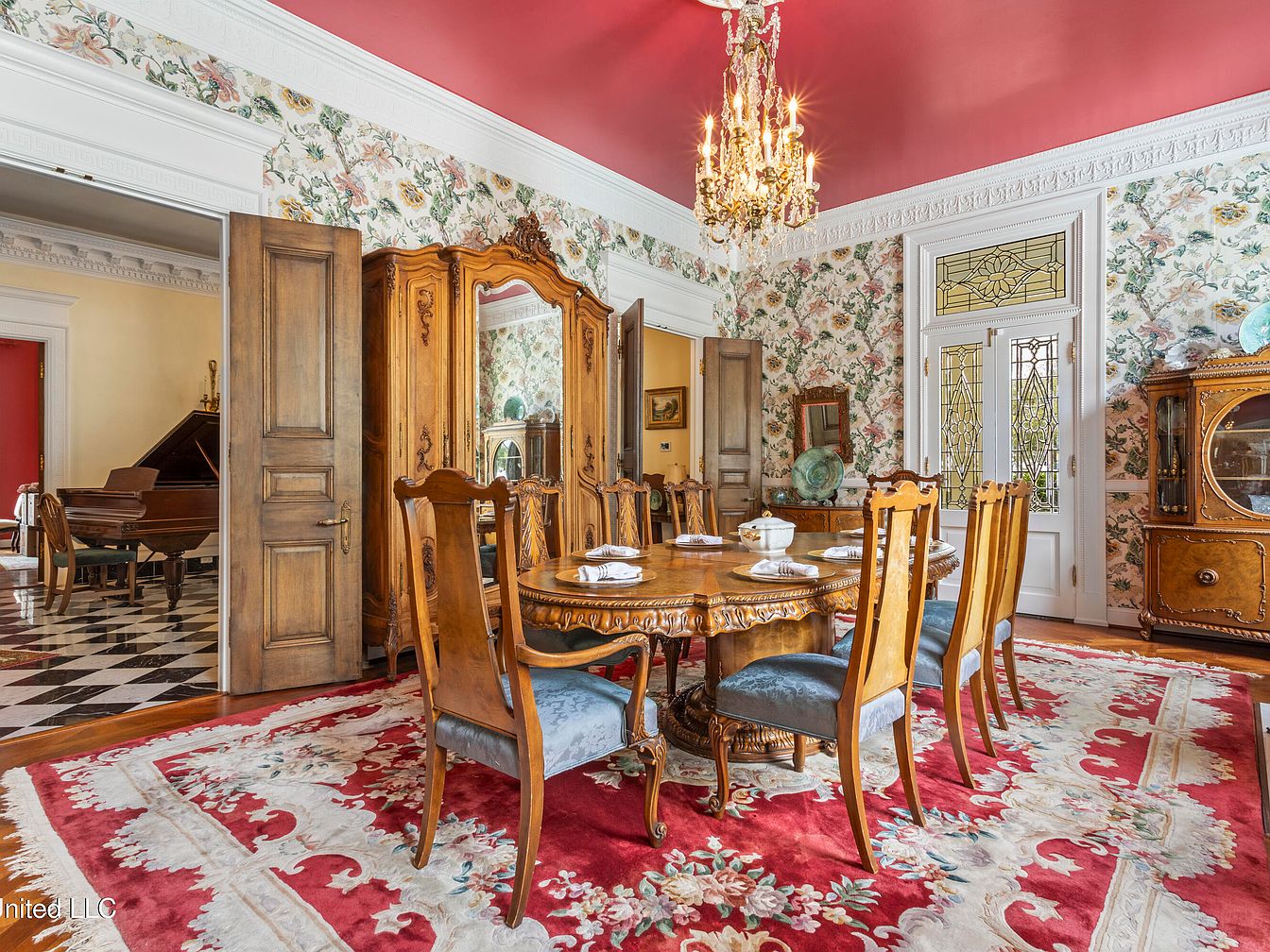 A grand dining room featuring an ornate wooden table surrounded by intricately carved chairs, adorned with blue upholstery. A luxurious chandelier hangs from the striking red ceiling, casting warm light across the room. The walls are decorated with floral-patterned wallpaper that adds a vintage feel. Rich wooden cabinetry, displaying decorative items, complements the room’s elegance. A large area rug in vibrant red with intricate designs grounds the furniture. The doorway to the adjacent room is framed with stylish woodwork, while an elegant stained glass door adds character and natural light, enhancing the refined ambiance.