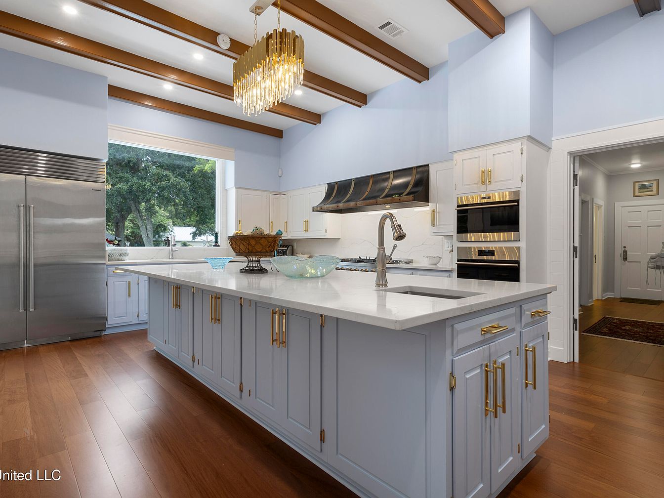 This kitchen showcases a spacious island with a pristine white countertop, surrounded by soft blue cabinetry adorned with gold handles. Above, exposed wooden beams contrast with the pale blue walls, enhancing the room’s airy feel. A striking chandelier made of cascading gold elements hangs over the island, illuminating the workspace. The stainless steel refrigerator and modern appliances are seamlessly integrated, providing a sleek look. Large windows allow natural light to flood in, while a decorative fruit bowl adds warmth. The polished hardwood floor ties the space together, reflecting a blend of modern elegance and traditional charm.