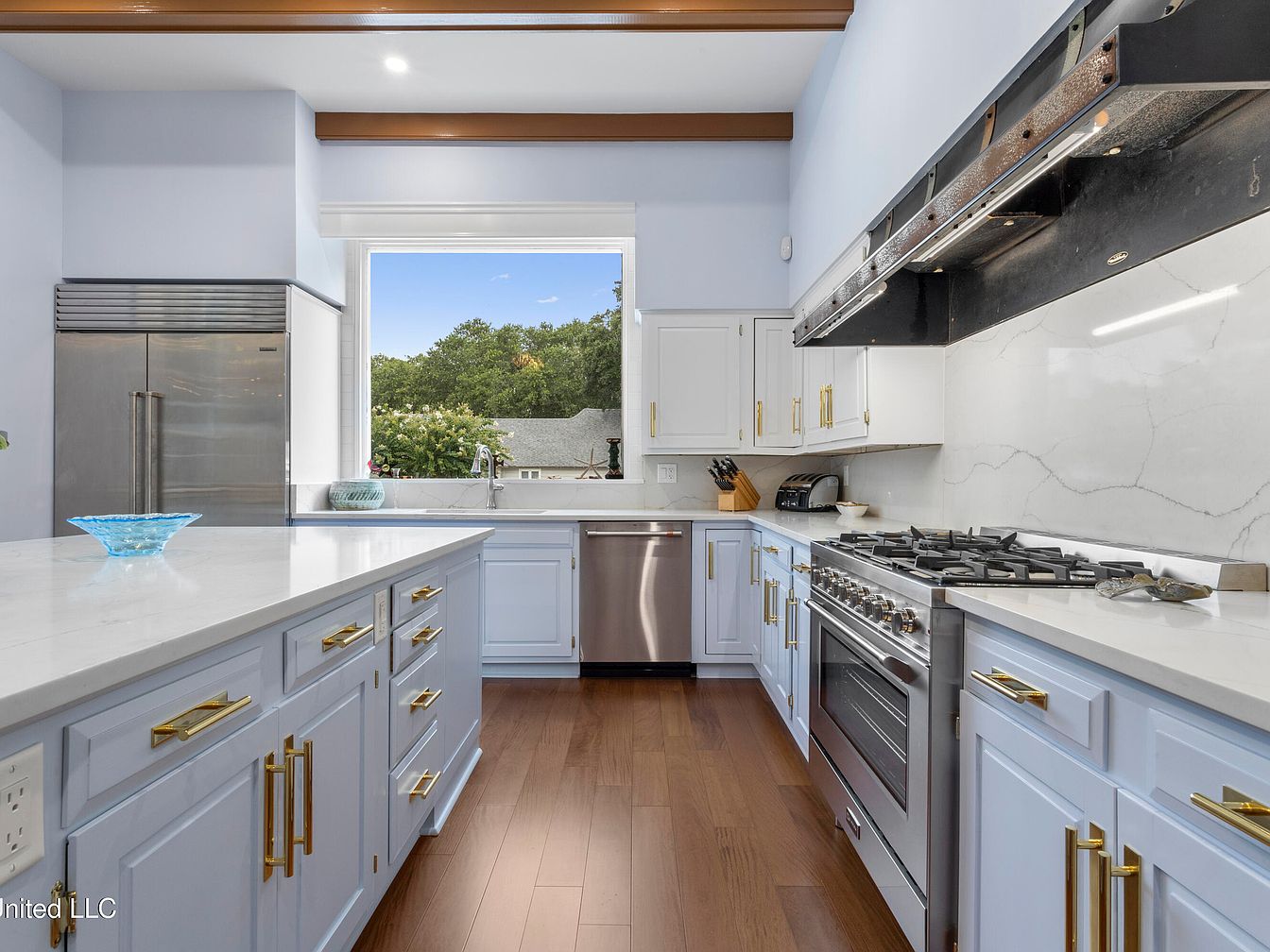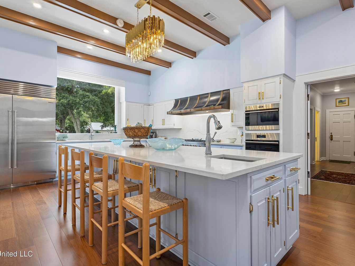 This spacious kitchen features a central island with a sleek marble countertop, accompanied by wooden stools. The cabinetry is painted in soft white with stylish gold handles, contrasting beautifully with the rich wooden floors. Exposed wooden beams run across the ceiling, adding warmth to the light blue walls. A large window provides natural light, offering a view of lush greenery outside. High-end appliances, including a stainless steel refrigerator and modern oven, integrate seamlessly with the design. A decorative bowl and glassware sit on the island, enhancing the kitchen’s inviting aesthetic.