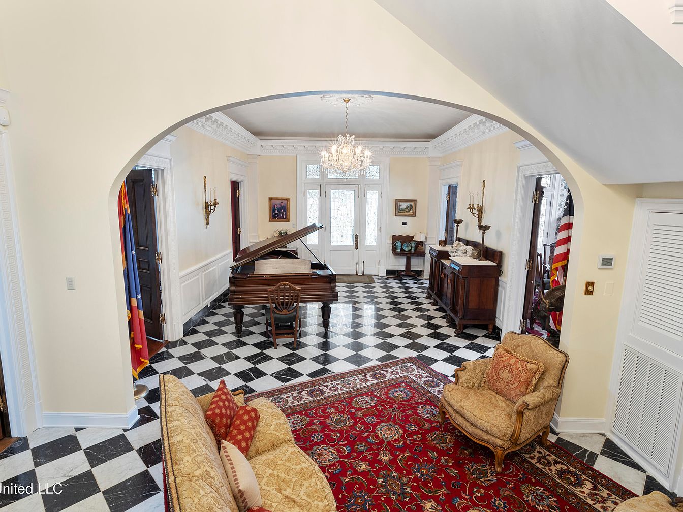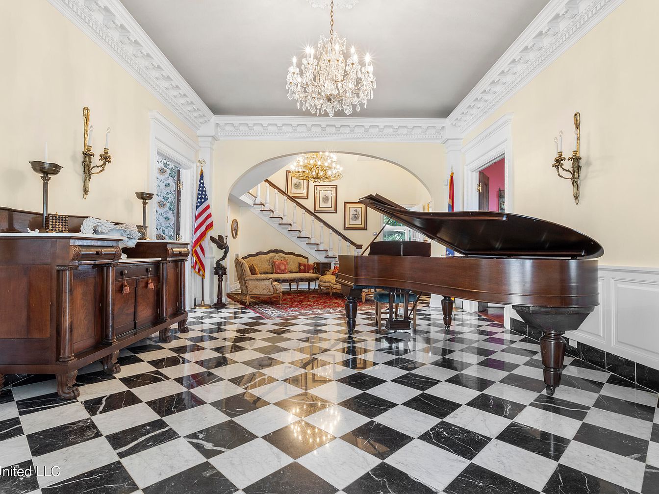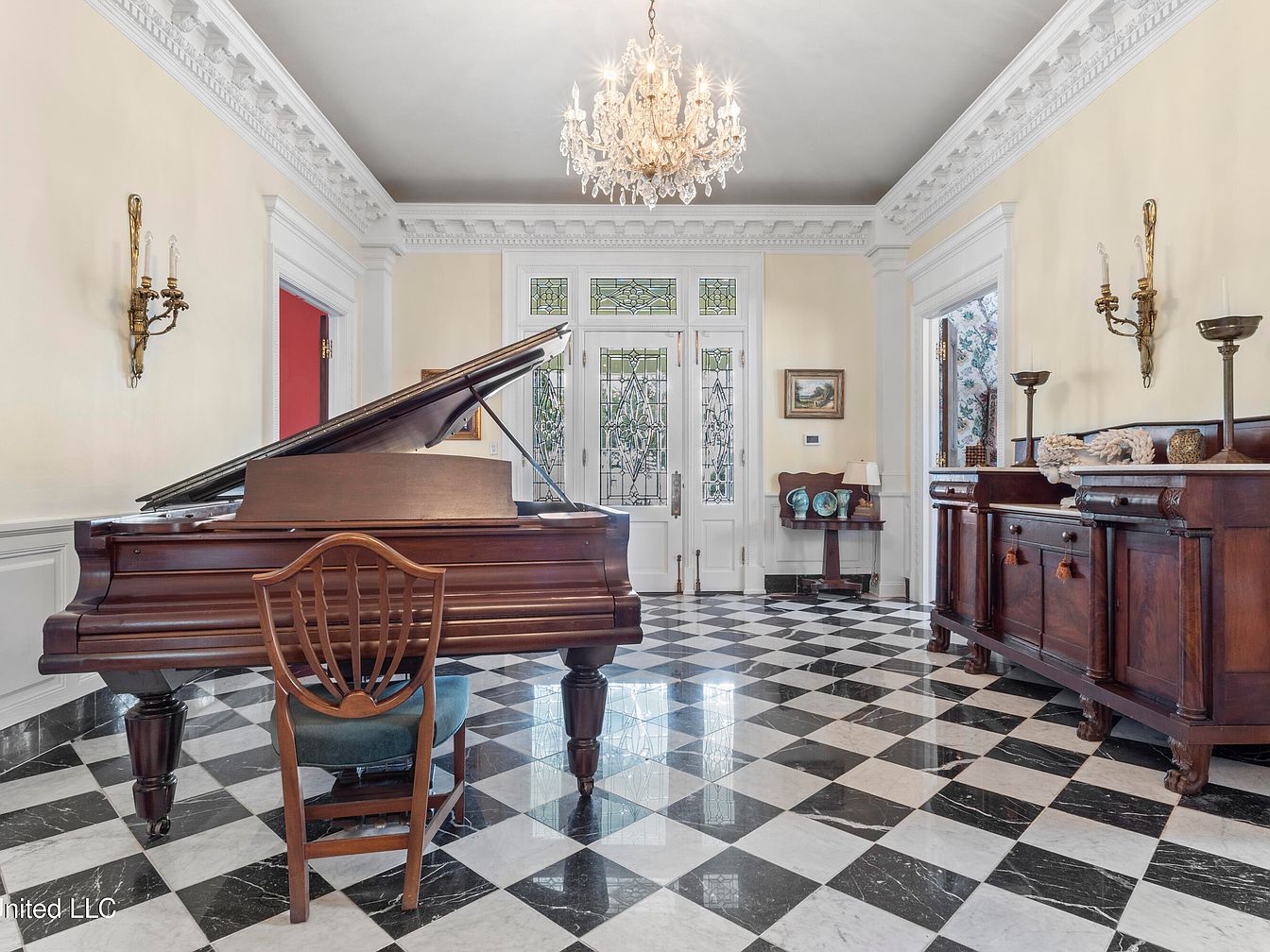 The entry hall features a grand, open layout with a striking black-and-white checkerboard marble floor, establishing a classic aesthetic. A large, ornate chandelier hangs overhead, illuminating the space with elegance. To the left, a grand piano beckons, accented by a cozy, gold-colored settee adorned with patterned cushions. The walls are painted a soft cream, complemented by detailed crown molding. Antique wooden furniture, including a side table with decorative items, adds to the historic charm. Natural light pours in through large, multi-paned windows, enhancing the airy feel, while rich reds from a patterned area rug provide warmth.