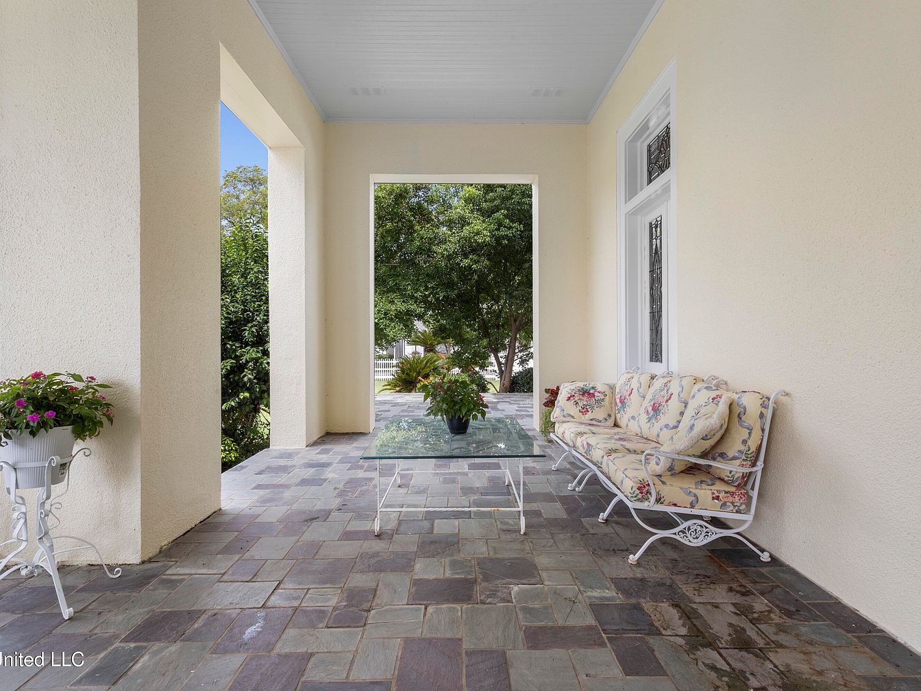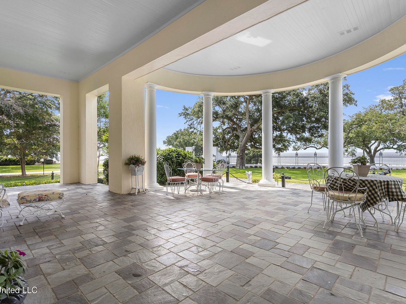 A spacious porch featuring a beautiful slate floor, bordered by large, elegantly designed white columns. The ceiling has a soft blue hue, complementing the warm beige of the walls. Several wrought iron tables and chairs, adorned with pastel cushions, create inviting seating arrangements. A floral bench rests against one wall, enhancing the serene atmosphere. Lush greenery surrounds the porch, with trees visible through the open areas, providing a natural backdrop. The setting is well-lit with natural sunlight, creating a welcoming ambiance for relaxation or gatherings, perfect for enjoying the scenic outdoor view.