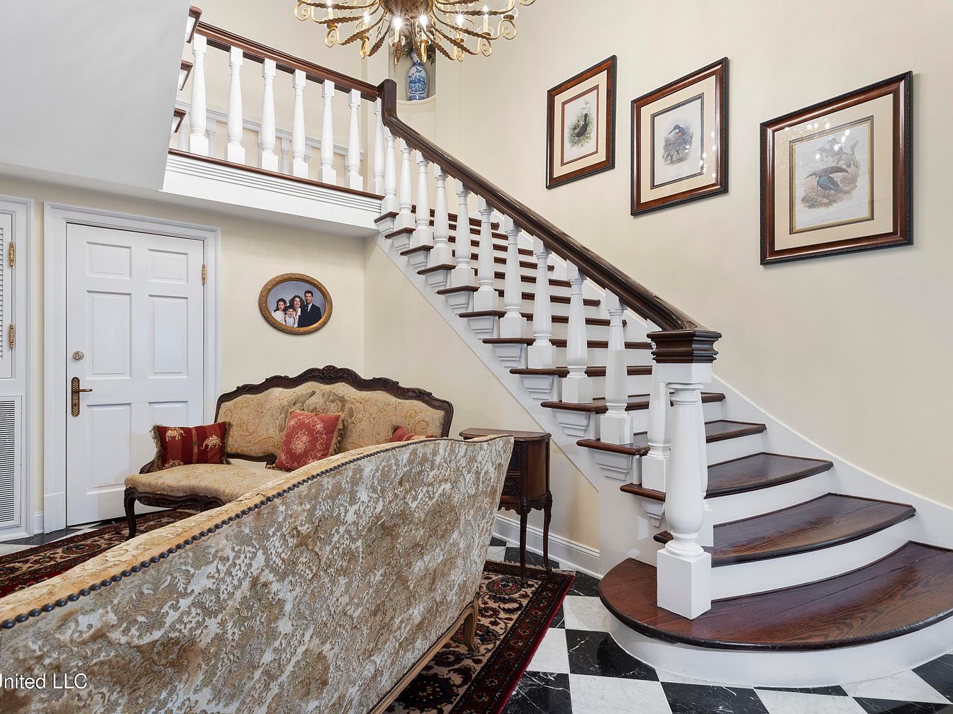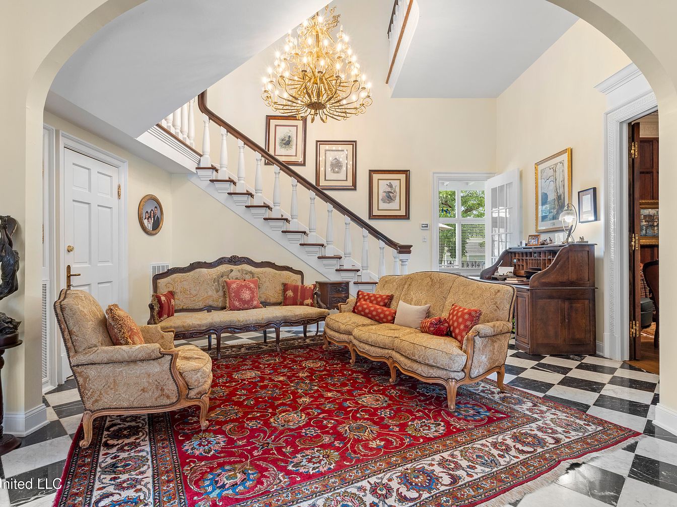 This foyer features an elegant staircase leading to the upper level, flanked by a decorative chandelier that casts a warm glow. The walls are painted a soft yellow, enhancing the inviting atmosphere. A vintage area rug in rich reds and intricate patterns anchors the sitting area, complemented by ornate furniture with detailed upholstery. A curved settee and two chairs invite relaxation, adorned with plush cushions for added comfort. Framed artwork adorns the walls, harmonizing with classic architectural details. The black and white checkered flooring adds a timeless sophistication, while a wooden writing desk provides functional charm.