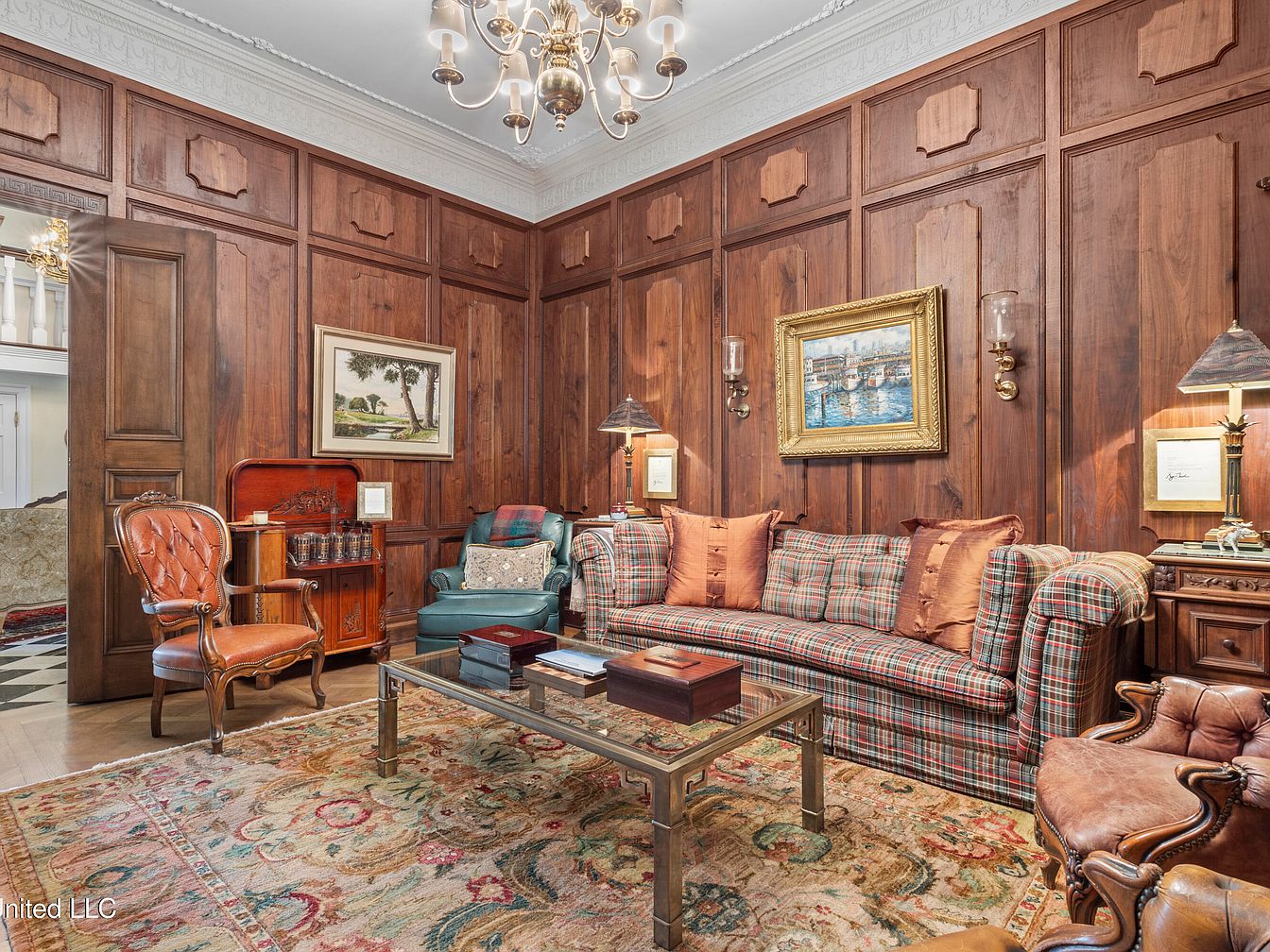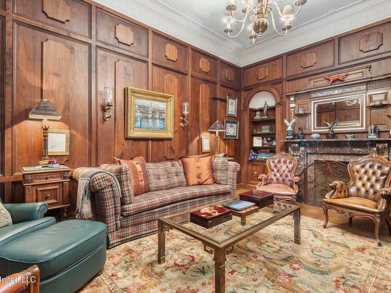 This elegant living room features rich wooden paneling that imbues the space with warmth and sophistication. A plaid upholstered sofa adorned with rust-colored cushions sits center stage, complemented by a uniquely designed glass coffee table. Flanking the sofa, ornate brass lamps illuminate the antique wooden end tables, enhancing the room’s classic charm. Across from the sofa, a vintage leather armchair creates a cozy reading nook. A vibrant Persian-style rug adds color and texture to the hardwood floor. The ceiling boasts intricate plasterwork, further highlighting the historical significance and luxurious aesthetic of this inviting space.