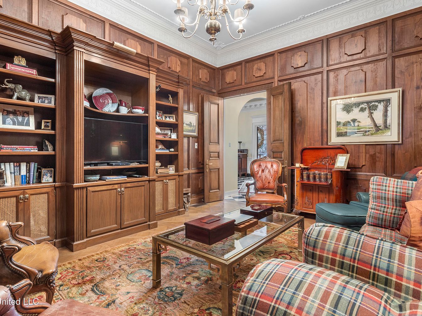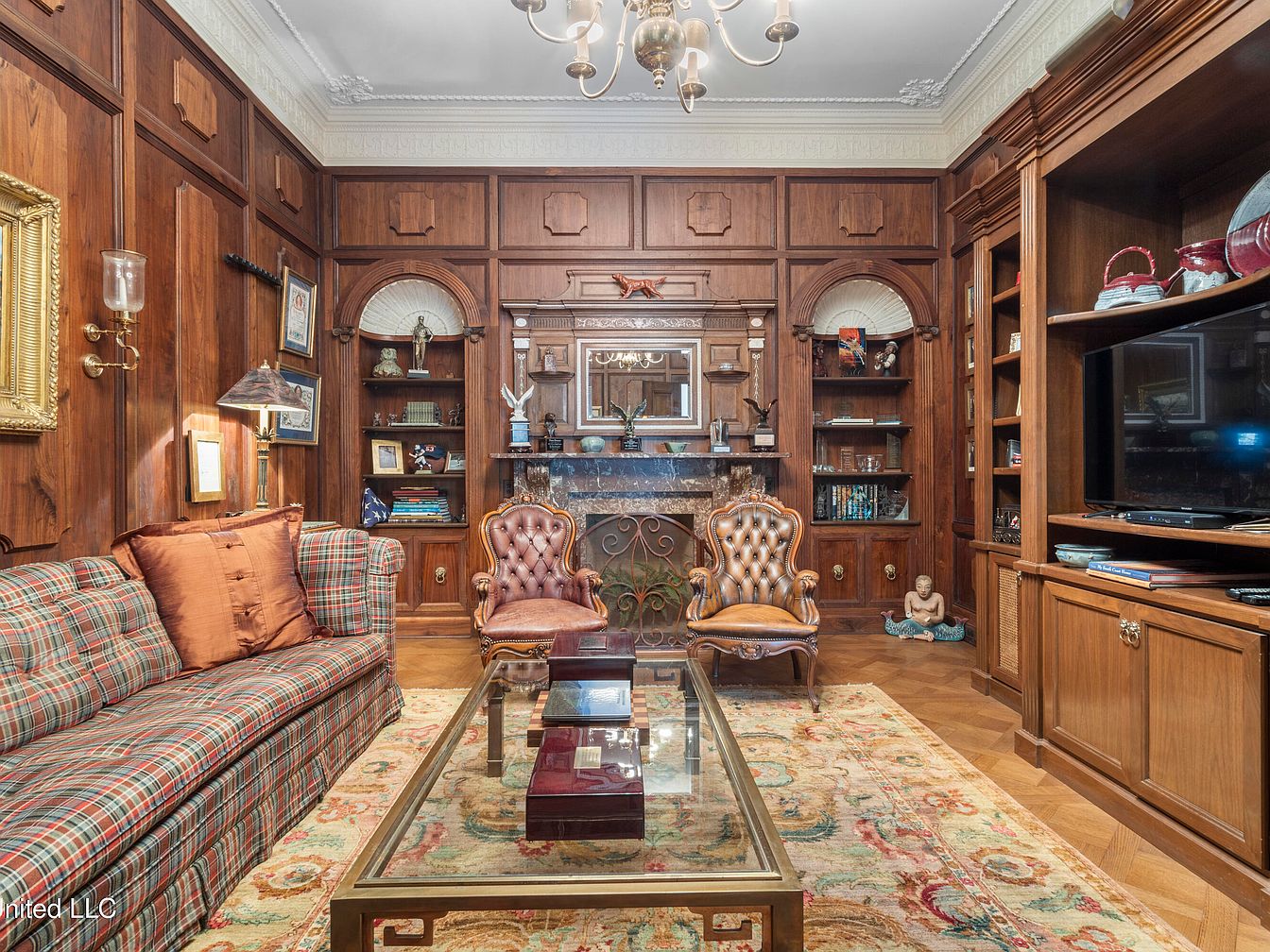 A cozy library study features rich wooden paneling that envelops the walls, providing warmth and a classic aesthetic. A large built-in bookshelf displays an array of books and decorative items, flanking a wall-mounted television. An antique, tufted leather chair adds a touch of elegance alongside a plaid upholstered sofa, creating a comfortable seating area. The intricately designed area rug anchors the room and complements the color scheme of earth tones and deep hues. A glass coffee table rests in the center, showcasing a few decorative boxes, while a chandelier casts soft light, enhancing the inviting atmosphere.