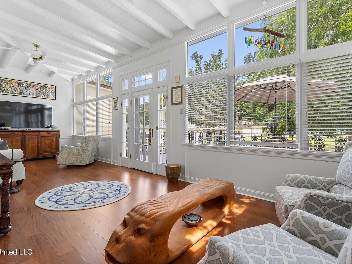 This sunroom features a spacious layout with high, white-beamed ceilings and abundant natural light from large windows. The color palette is predominantly light, with a warm wooden floor complementing the soft white and pastel shades of the furnishings. A large television rests against a vintage wooden cabinet, while a unique carved wooden console table adds character. Comfortable armchairs are upholstered in a subtle geometric pattern. An inviting round area rug, adorned with a floral design, anchors the seating area. Decorative elements, like a colorful wind chime visible outside, enhance the cheerful ambiance.