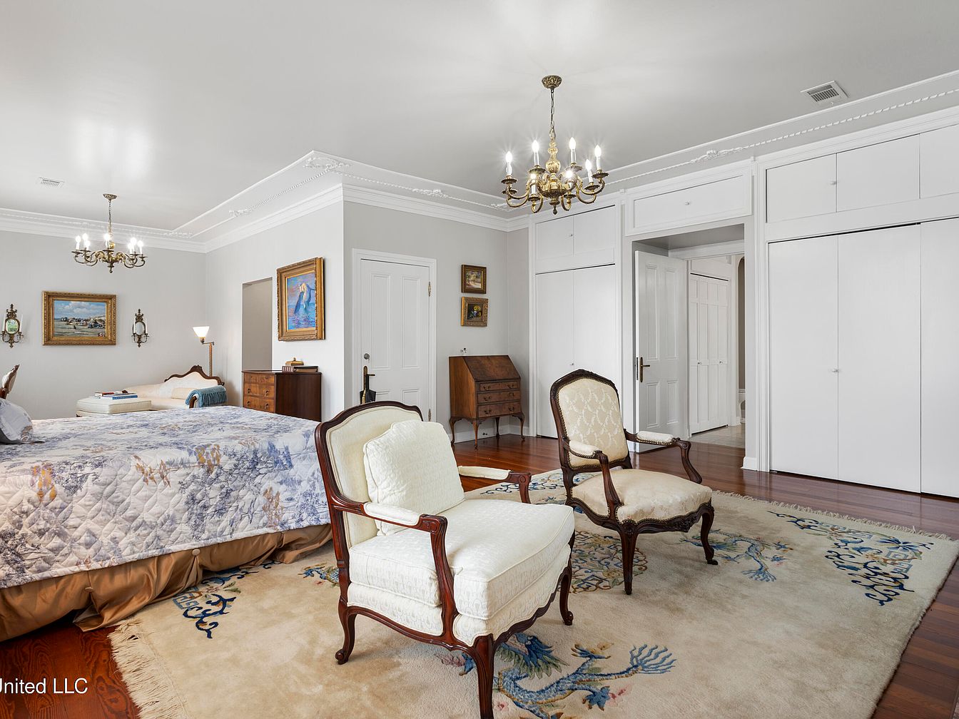 This spacious bedroom combines classic design with modern comforts. A large bed is centered, adorned with a detailed quilt in soft pastel hues. Elegant wooden furniture, including a vintage dresser and two upholstered chairs, enhances the sophisticated atmosphere. The walls are painted a soft gray, providing a neutral backdrop for framed art pieces that add character. A plush area rug with intricate patterns underfoot brings warmth and texture. Crown molding and a striking chandelier complete the aesthetic, balancing elegance with functionality. Ample closet space is cleverly integrated, ensuring a tidy and inviting environment.