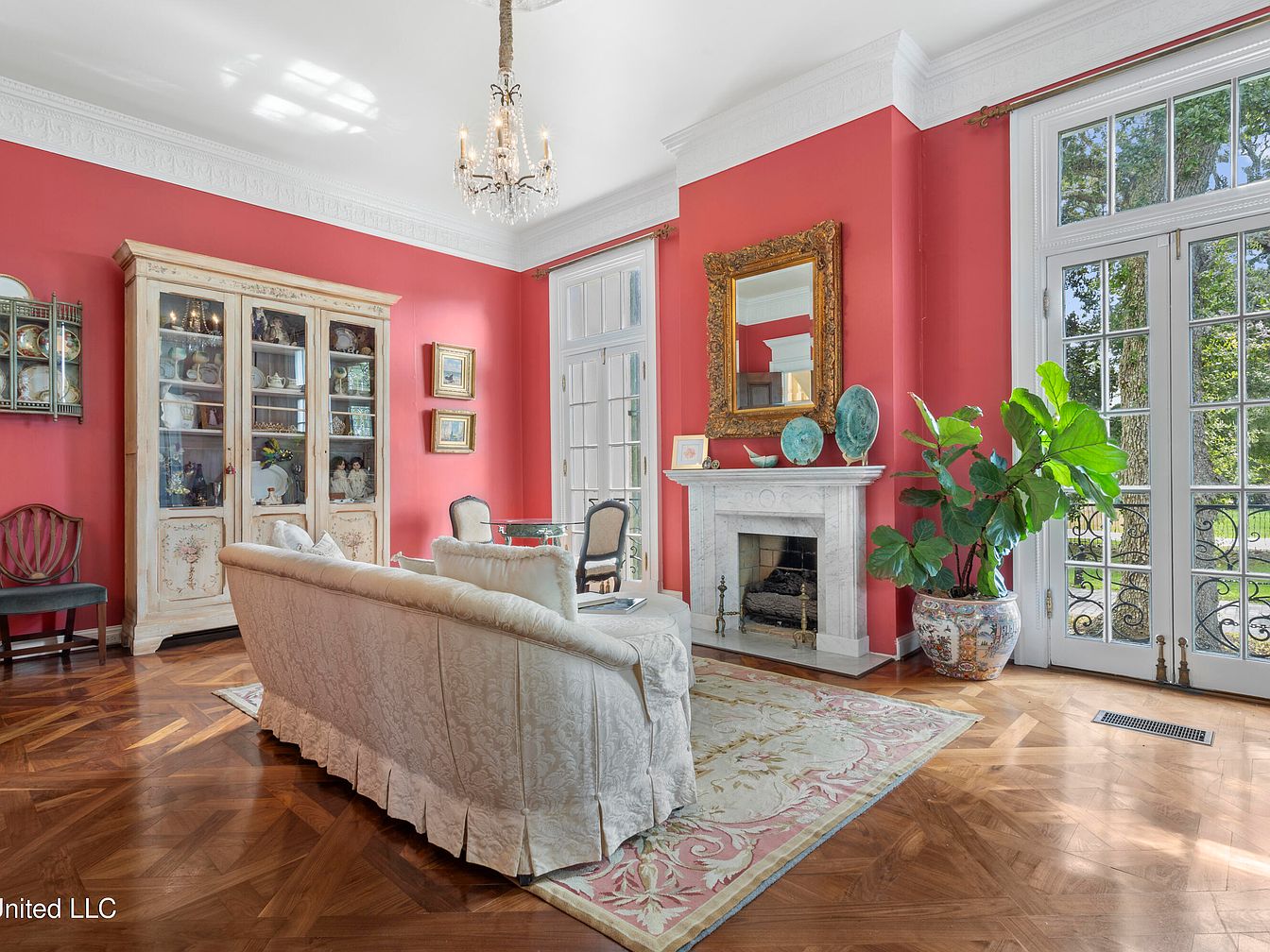 A vibrant living room features striking red walls that enhance the elegance of the space. Antique furniture is showcased, including a delicate white sofa adorned with plush cushions. A glass-fronted cabinet filled with intricate china sits against one wall, while an ornate gold-framed mirror reflects light from large windows dressed with light curtains. The hardwood floor, with its intricate herringbone pattern, adds warmth and sophistication. A small fireplace, crafted from white marble, anchors the room. Decorative plants in ceramic pots introduce a touch of nature, enhancing the inviting ambiance, perfect for social gatherings.