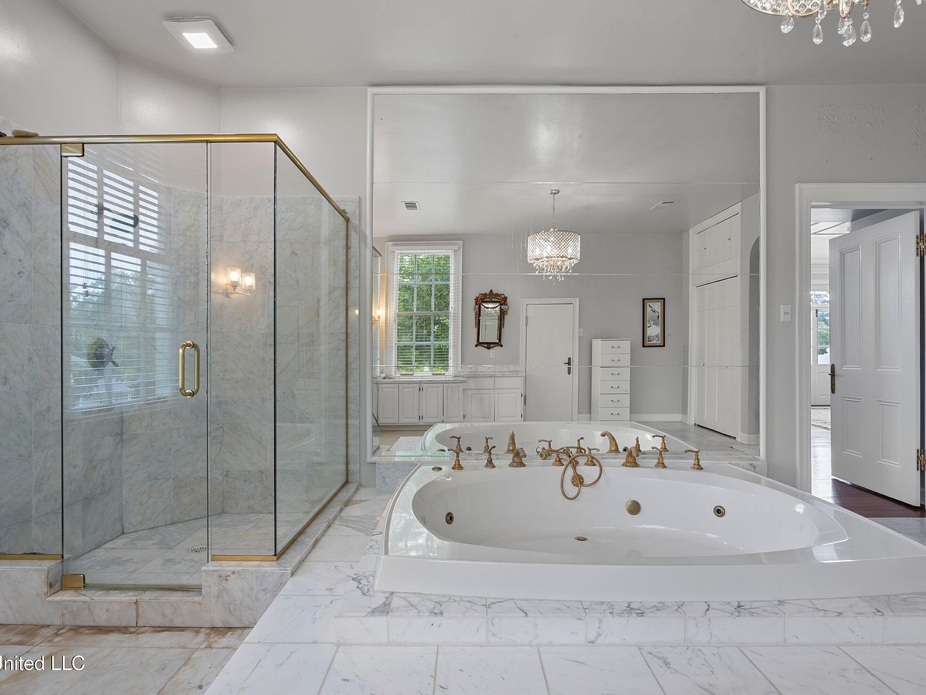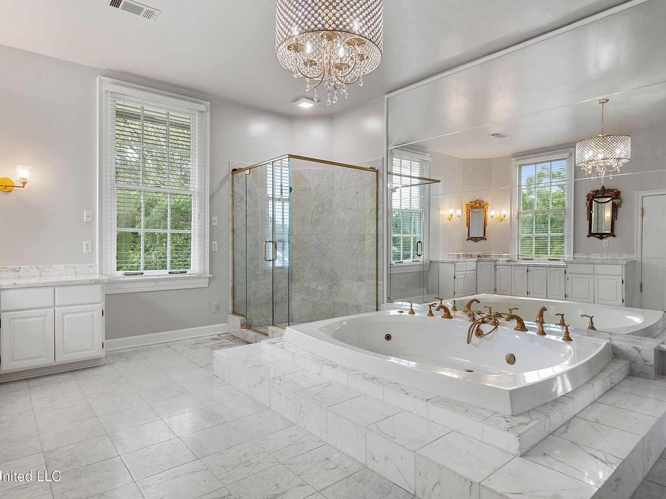 A luxurious bathroom suite showcases elegance and comfort. The layout features a spacious soaking tub centered in a marble platform, with gold fixtures that add sophistication. A glass-enclosed shower stands to the side, complemented by neutral-toned tiles that enhance the airy feel. Large windows allow natural light to flood the space, accented by white blinds. Dual chandeliers and wall sconces provide soft illumination, while ornate mirrors create depth. The cabinetry, painted white, harmonizes with the overall color scheme, contributing to a serene and inviting atmosphere, perfect for relaxation and rejuvenation.